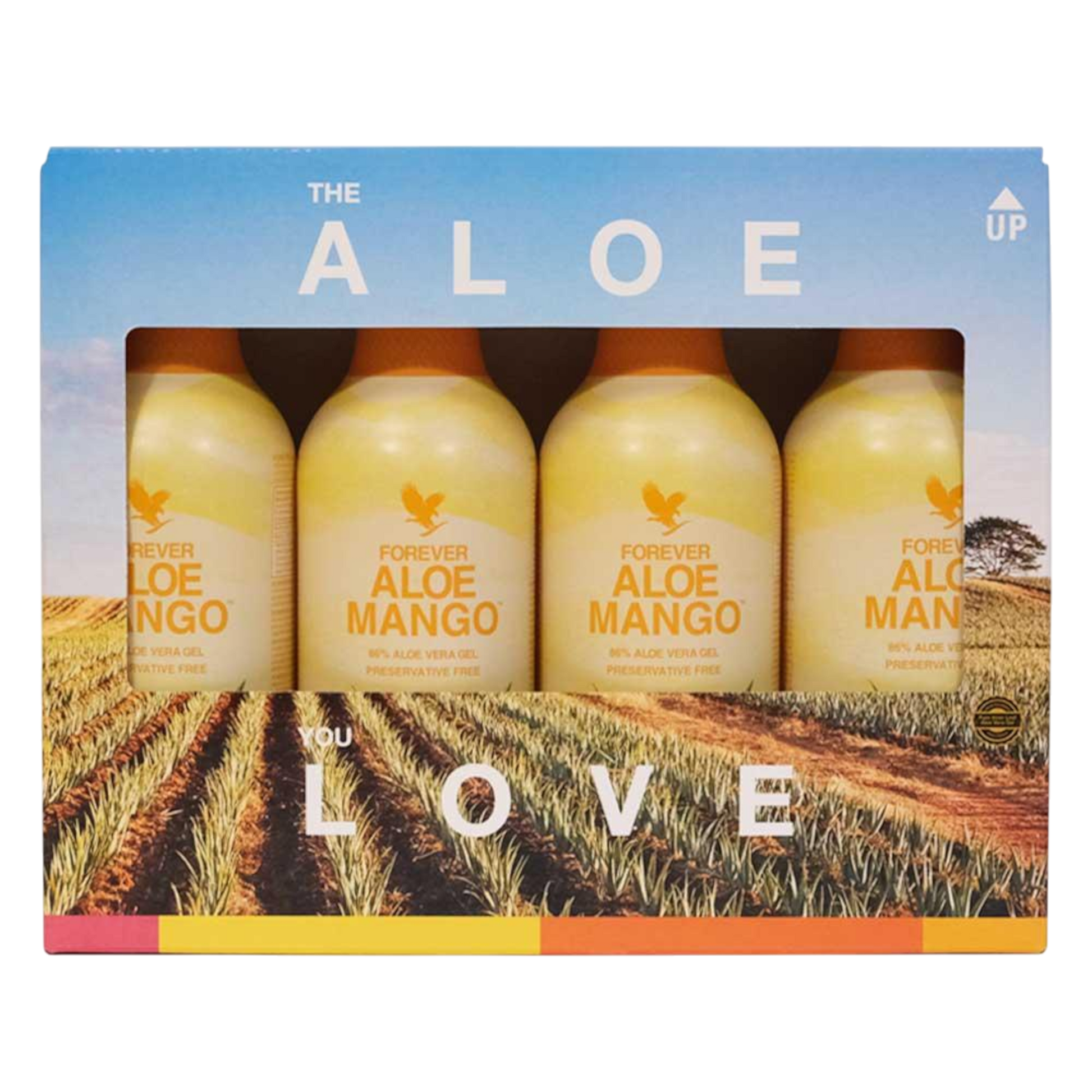 Stabilisiertes Aloe-Vera-Gel [inneres Aloe-Vera-Blattgel (86 %), Vitamin C (L-Ascorbinsäure), Antioxidationsmittel (L-Ascorbinsäure), Säureregulator (Zitronensäure)], Mango-Püree-Konzentrat (10 %), Fructose, Aroma (Mango).