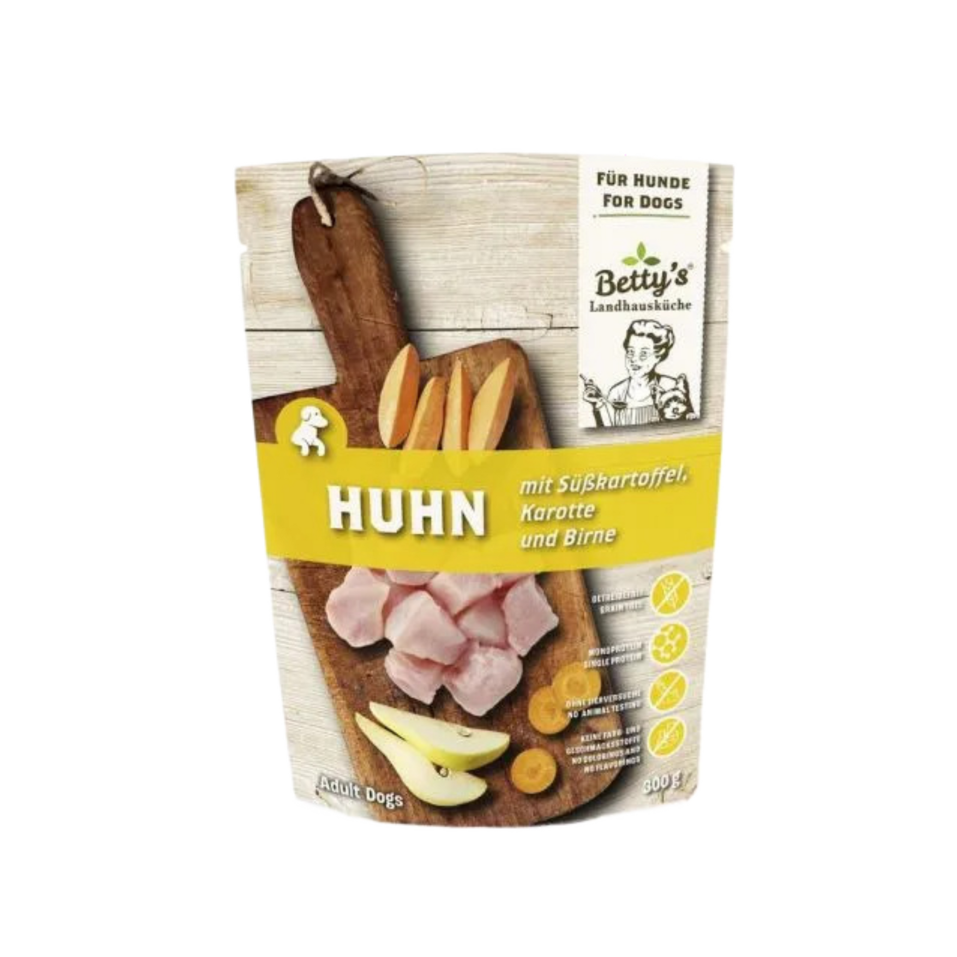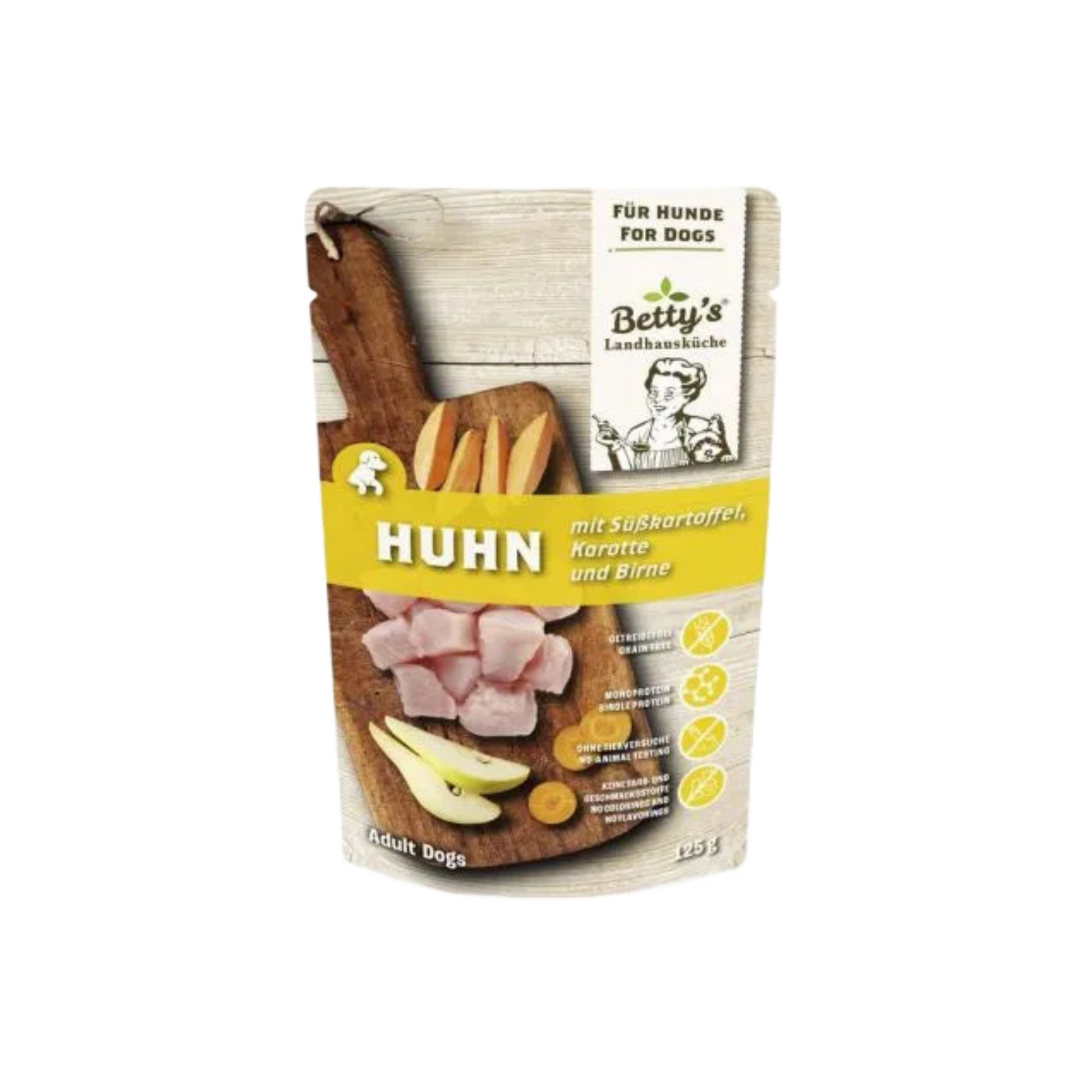 Betty’s Landhausküche Huhn mit Süßkartoffel, Karotte & Birne bietet deinem Vierbeiner ein köstliches, nährstoffreiches Menü, das selbst wählerische Hunde begeistert. Zartes, mageres Hähnchenfleisch wird mit vitaminreicher Süßkartoffel, knackiger Karotte und fruchtiger Birne kombiniert, um ein besonders bekömmliches und ausgewogenes Futter zu bieten.