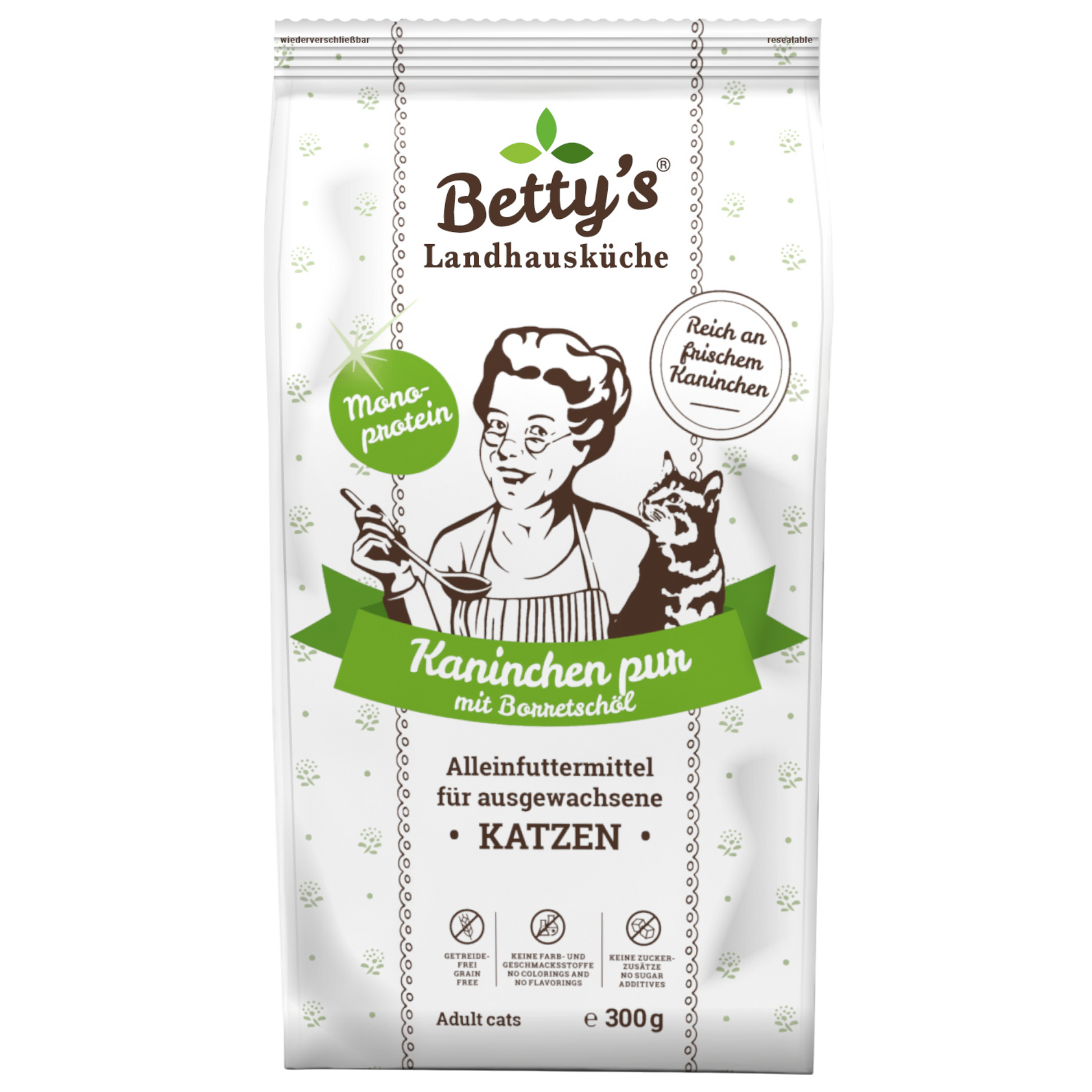 Betty’s Landhausküche Kaninchen pur steht für klare Rezepturen, hohe Verträglichkeit und funktionalen Mehrwert. Ein Monoprotein-Trockenfutter für Katzenhalter, die bewusst füttern – und für Katzen, die sensible Ernährung brauchen, ohne auf Genuss zu verzichten.