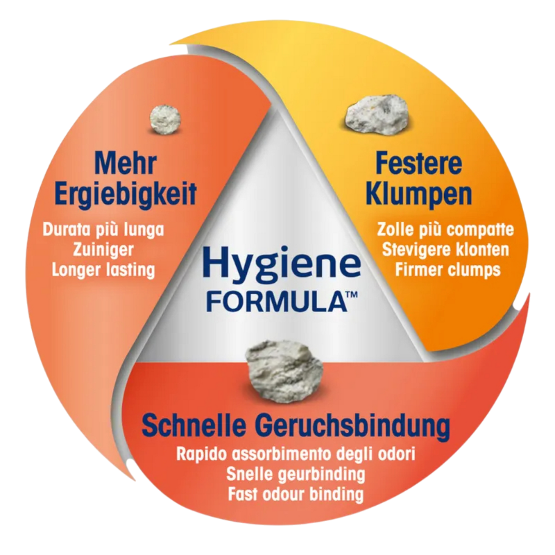 Die großen Körner wirken wie kleine Schwämme und nehmen Gerüche sowie Flüssigkeit besonders effektiv auf. Die mittleren Körner bilden schnell stabile, flache Klumpen, die sich leicht entnehmen lassen. Die kleinen Körner optimieren die Ergiebigkeit, indem sie sich im gesamten Streubett verteilen und die Leistung der größeren Korngrößen verstärken.