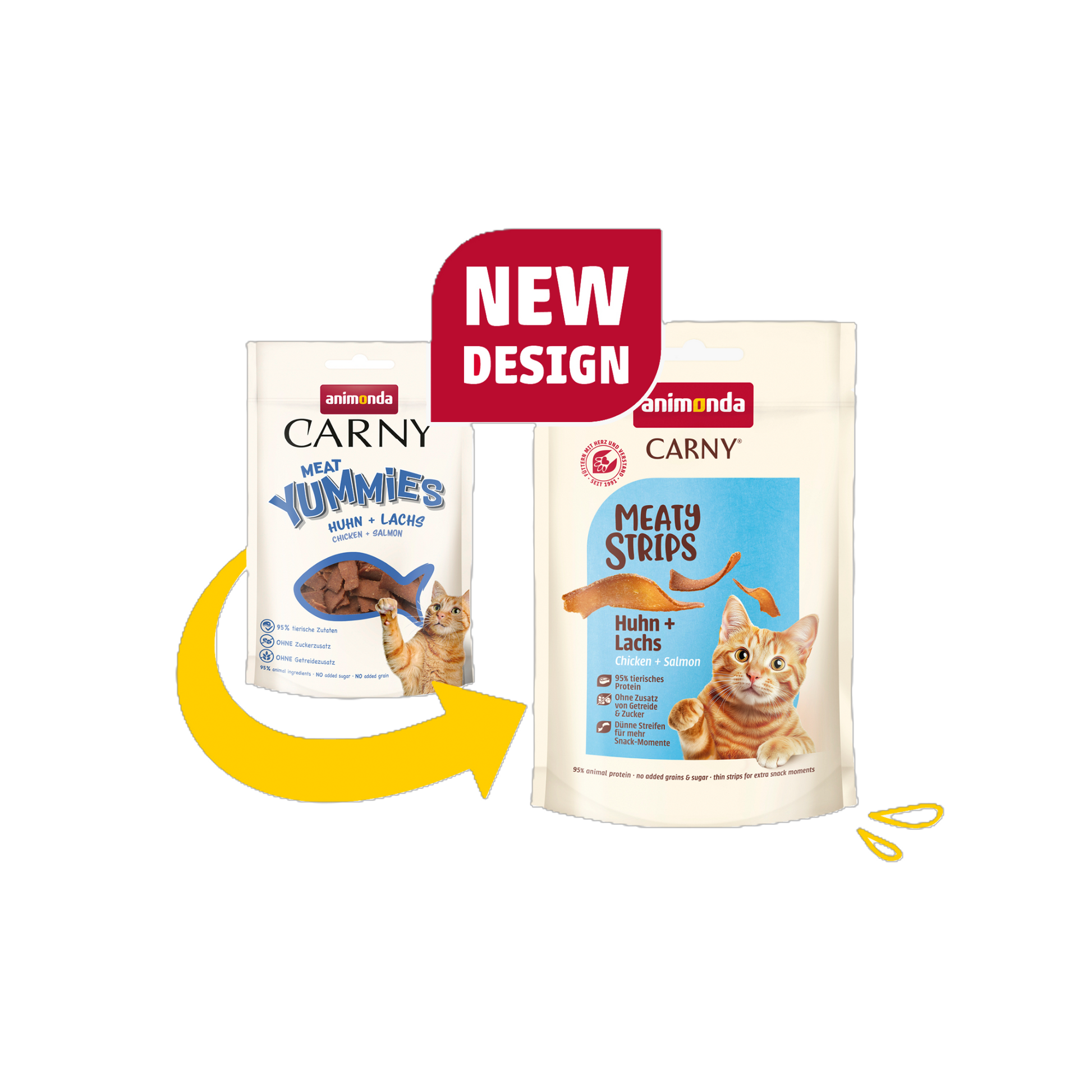 Carny Adult Meaty Strips Huhn + Lachs stehen für konsequenten Fleisch- und Fischgenuss in Snackform. Klar positioniert, hochwertig formuliert und ideal geeignet, um Katzen gezielt zu verwöhnen und emotional zu binden – ein Premium-Snack mit Mehrwert und Genussfaktor.