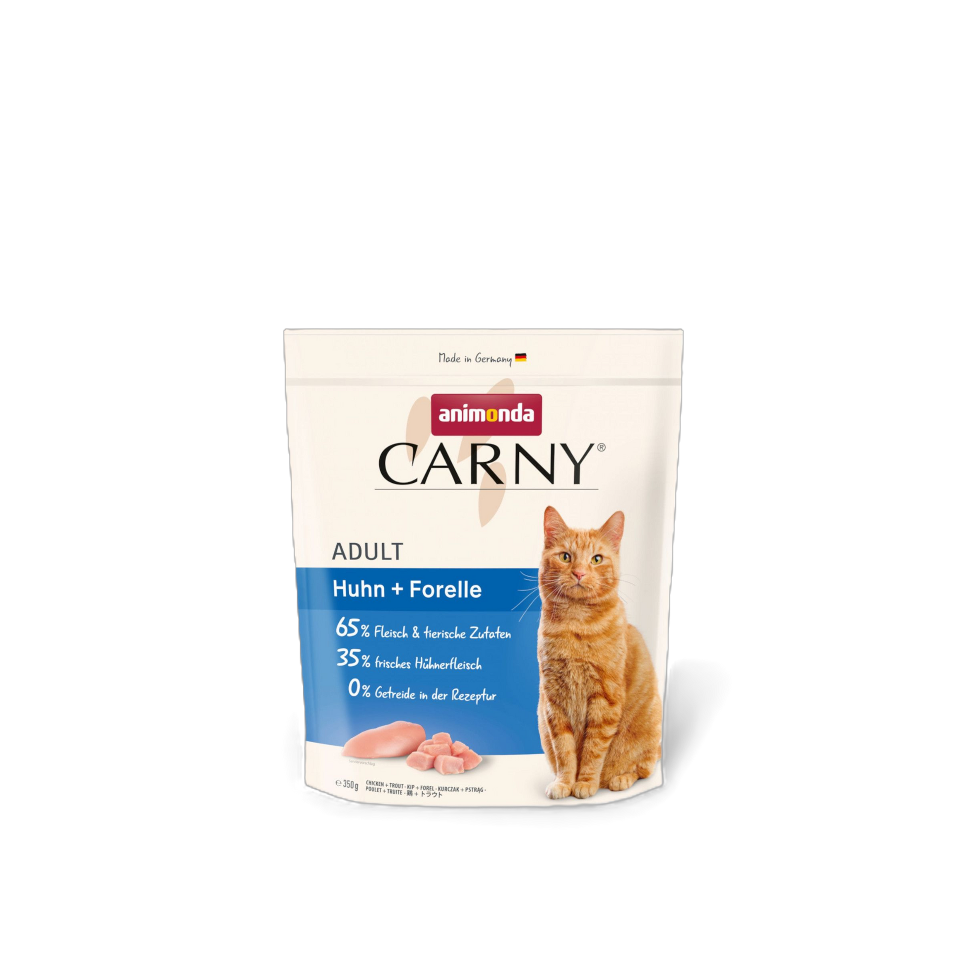 35 % frisches Hühnerfleisch, Geflügelprotein (getrocknet), Kartoffelstärke (getrocknet), Erbsenstärke, Erbsen, Rübenschnitzel, 4 % Forellenprotein (getrocknet), Geflügelprotein hydrolisiert, Geflügelfett, Geflügelleber, Erbsenfasern, 1 % Lachsöl, Mineralstoffe, Chicoree (getrocknet).