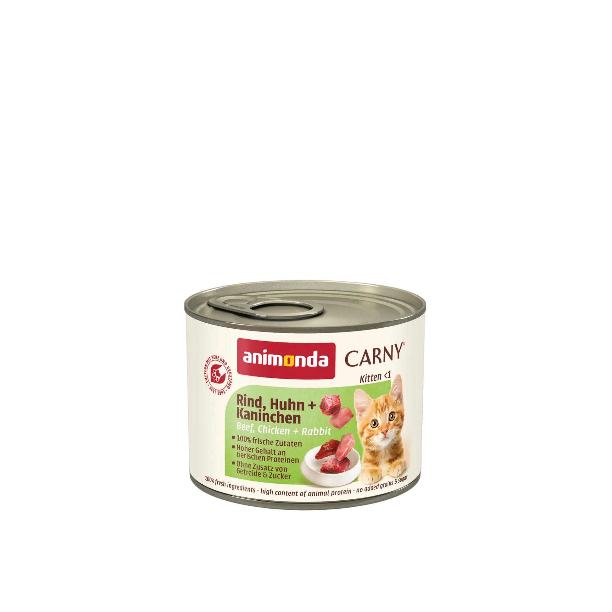 Carny Kitten Rind, Huhn + Kaninchen wurde gezielt für Kätzchen im ersten Lebensjahr entwickelt. Die ausgewogene Kombination aus herzhaftem Rind, leicht verdaulichem Huhn und zartem Kaninchen sorgt für Abwechslung im Napf und eine sehr gute Verträglichkeit – ideal für Kitten, die Nassfutter neu entdecken oder bereits lieben.