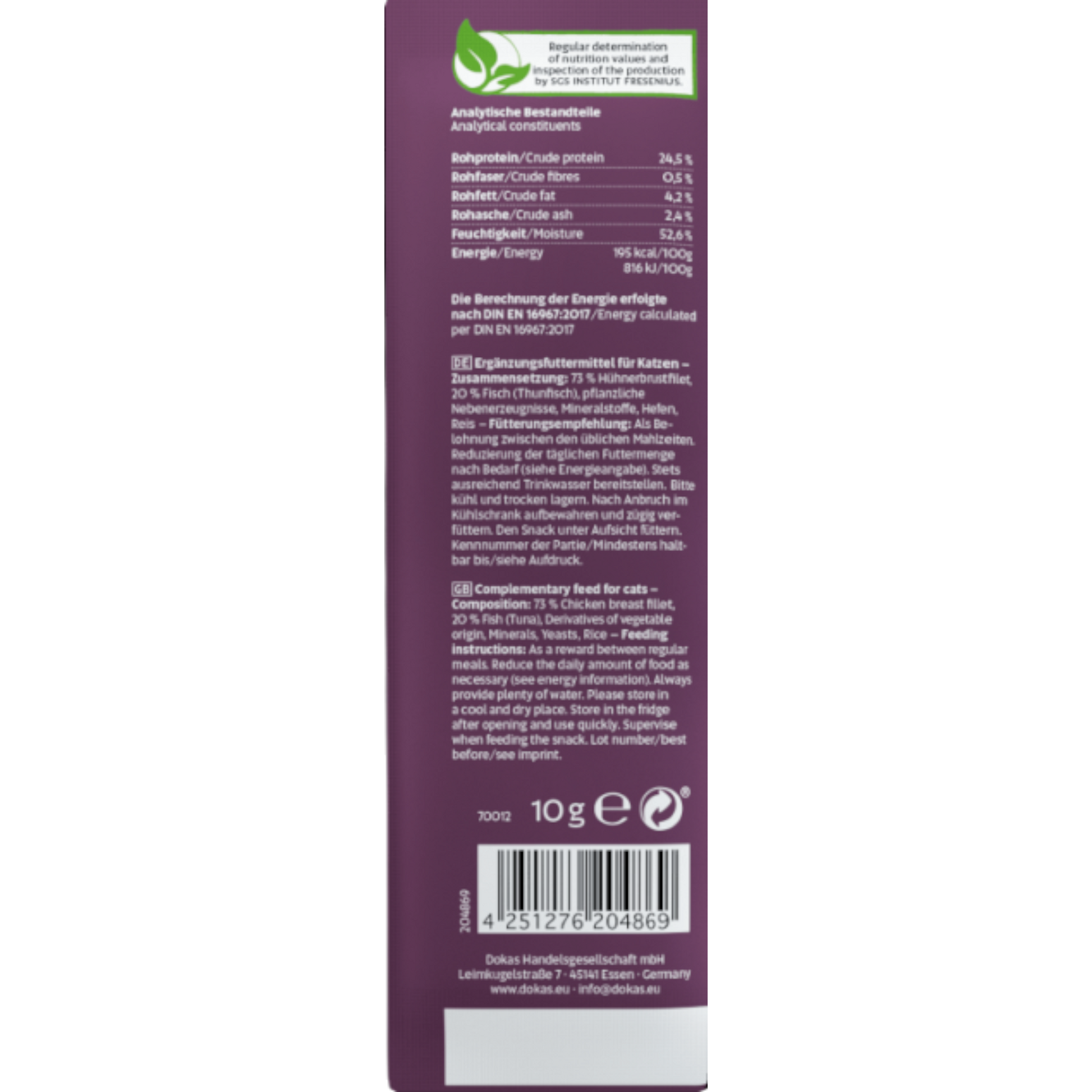 Die Dokas Cat Snack Hühnchen-Rolle mit Thunfisch vereint außen mildes, zartes Hühnchen mit einer aromatischen Füllung aus hochwertigem Thunfisch. Diese Kombination sorgt für ein zweifaches Geschmackserlebnis, das besonders bei fischliebenden Katzen hervorragend ankommt 🐾💛