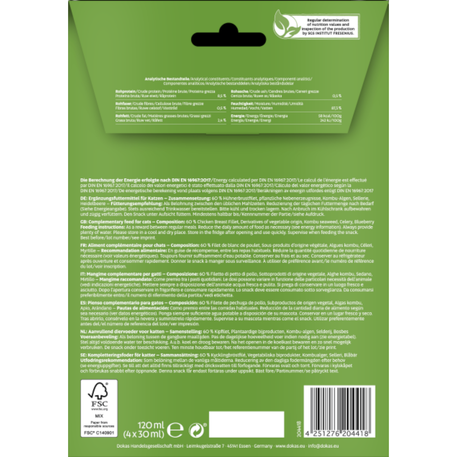Der Dokas Cat Snack Hühnchen-Smoothie ist eine samtweiche, flüssige Belohnung, die selbst wählerische Katzen begeistert. Die Rezeptur aus feinem Hühnchen liefert ein natürliches, aromatisches Geschmackserlebnis – perfekt zum Schlecken, als Topping oder als kleine Verwöhneinheit zwischendurch 🐾💛