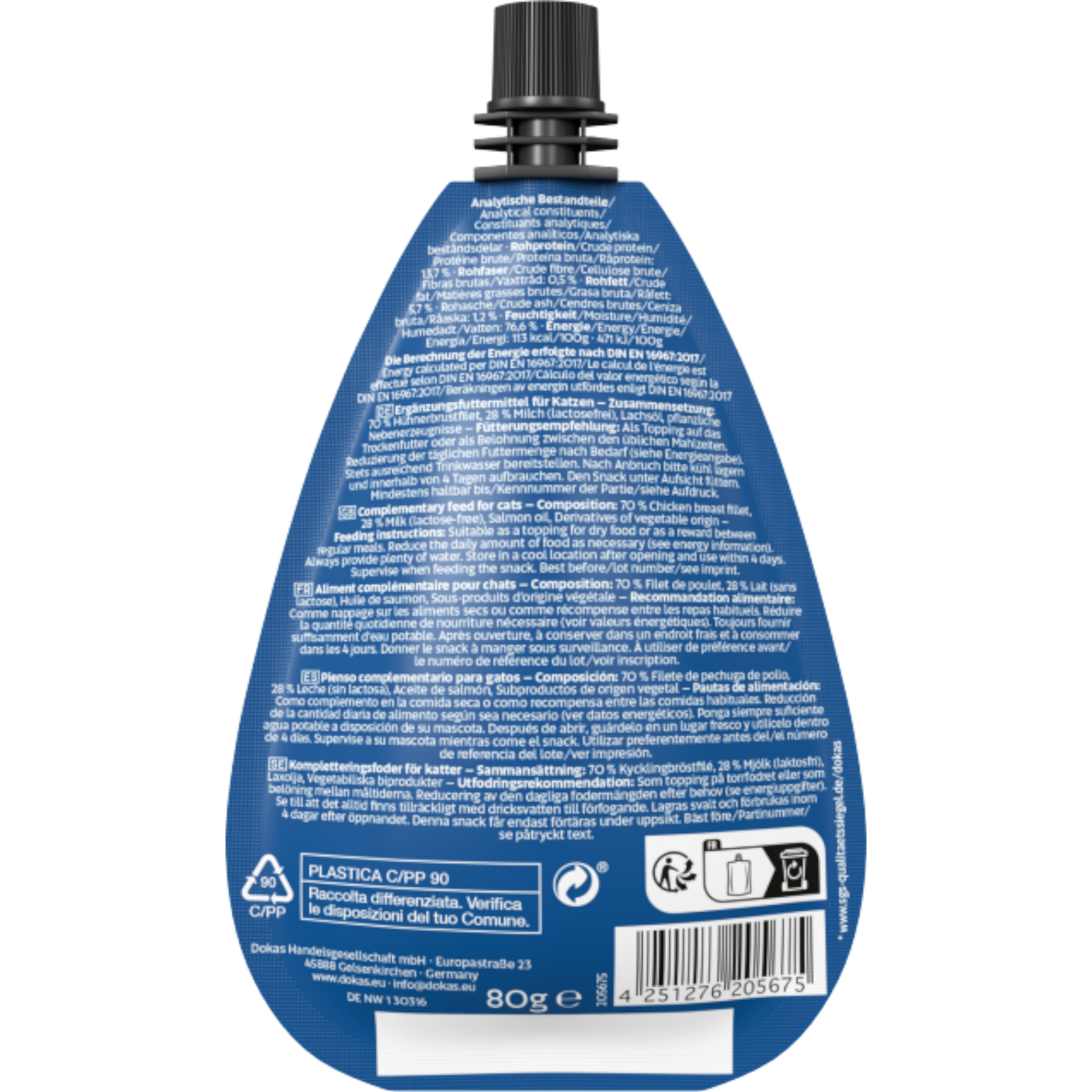 Die Dokas Cat Snack Milch-Creme mit Hühnerbrust verbindet cremige, milde Milch mit zartem Hühnerbrustgeschmack – ein besonders sanfter Schleck-Snack, der ideale Akzeptanz selbst bei wählerischen Katzen bietet 🐾💛