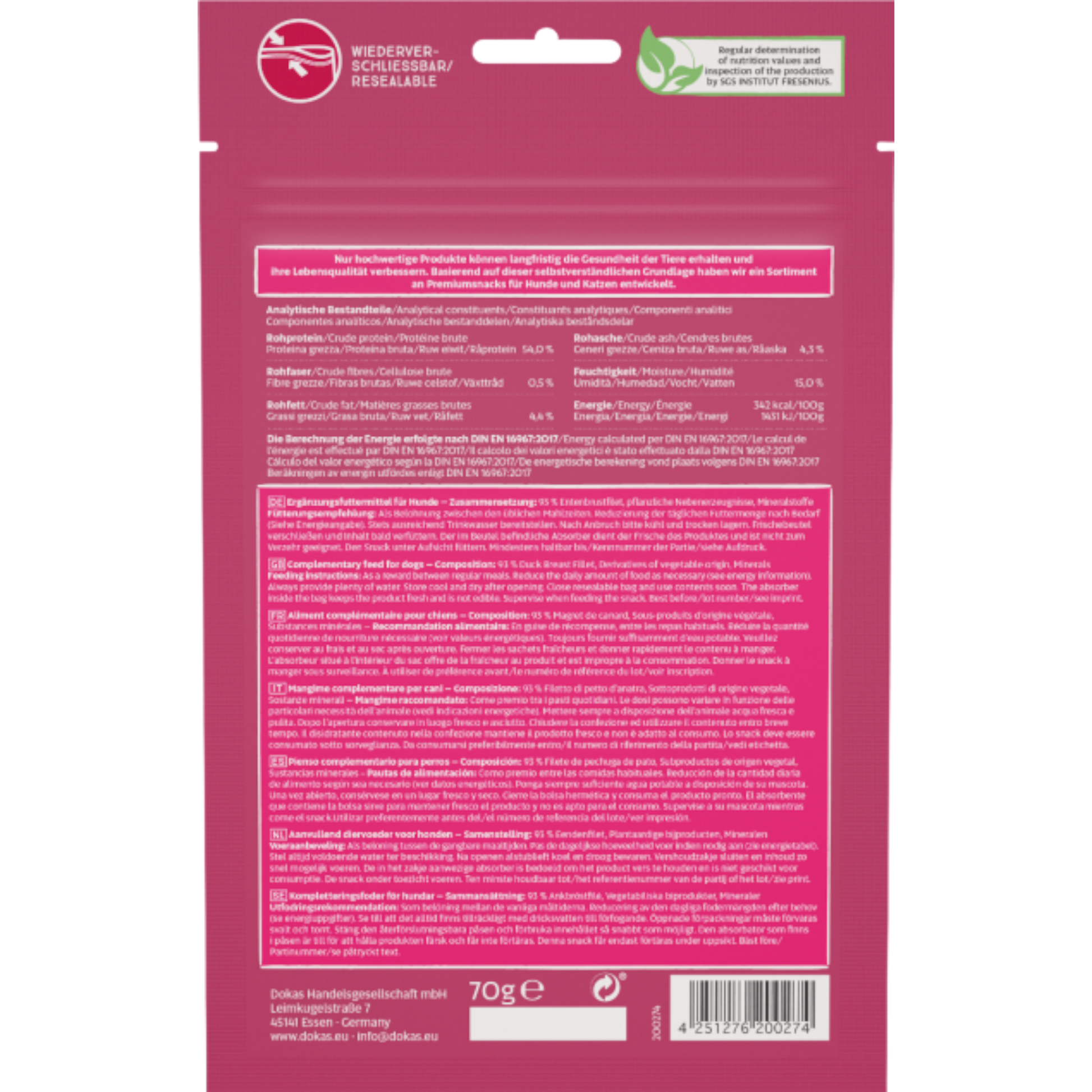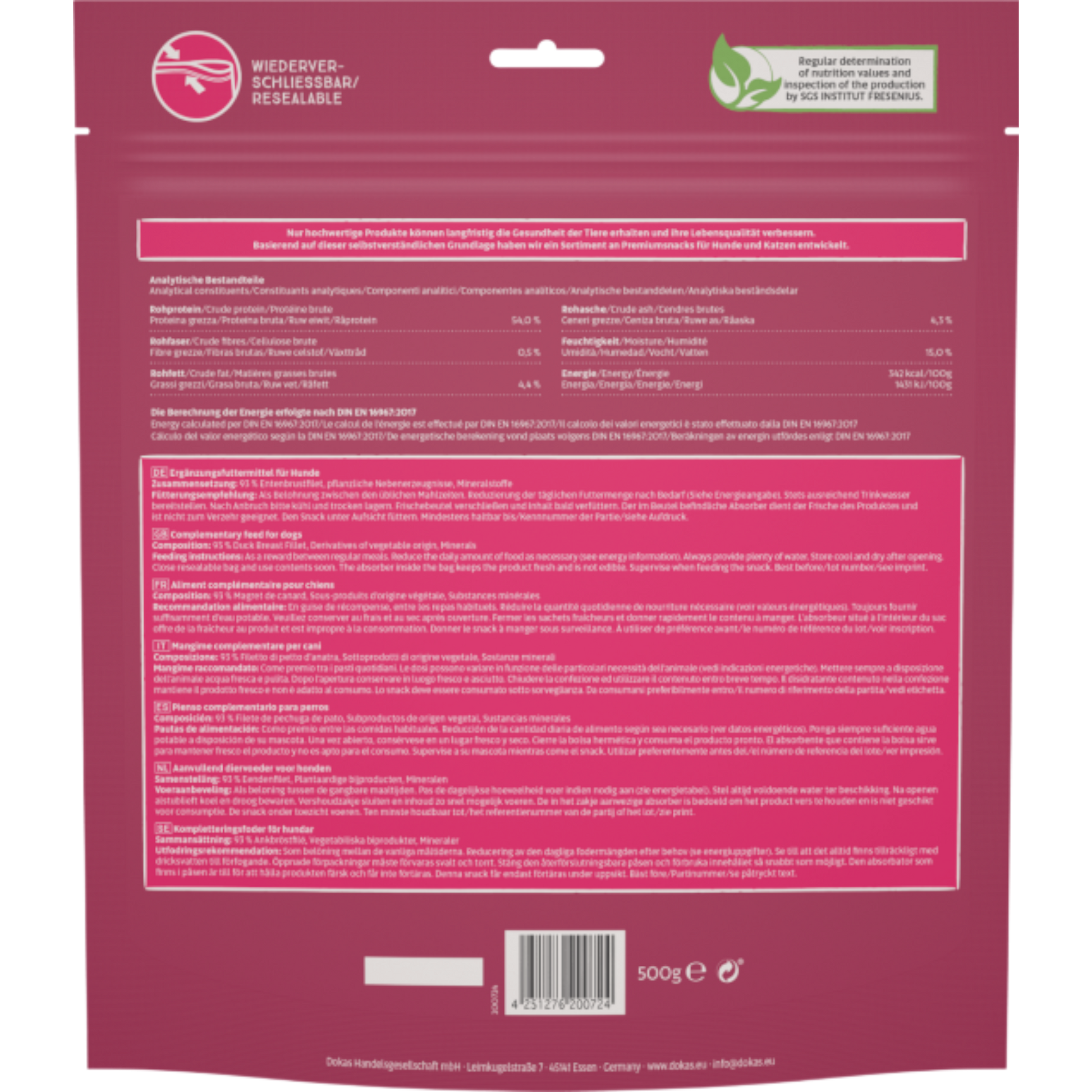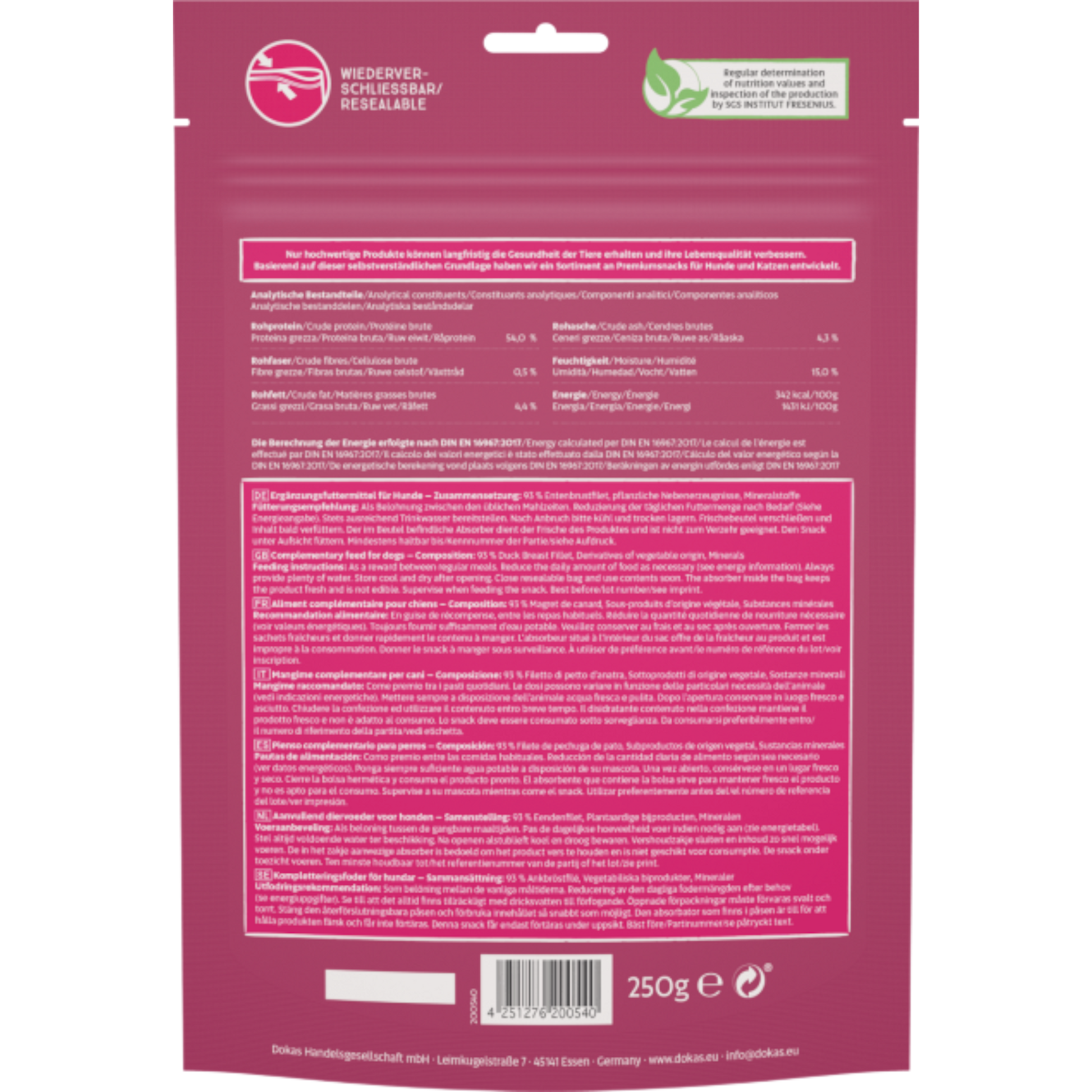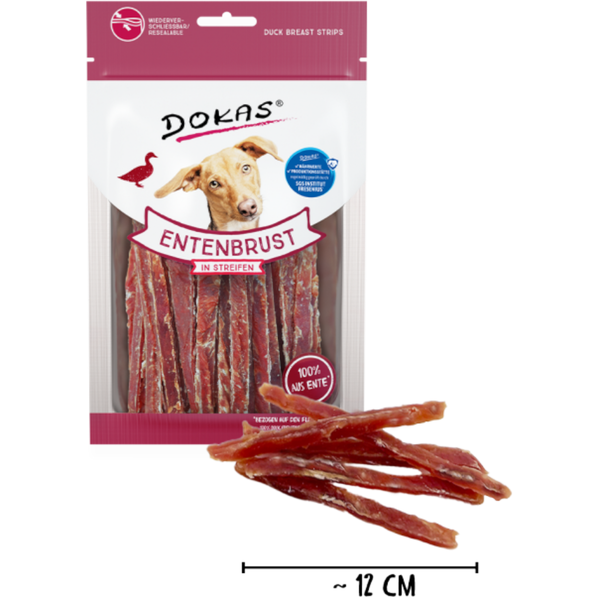 Die Dokas Dog Snack Entenbrust Streifen bieten Hunden ein besonders geschmackvolles Snack-Erlebnis. Gefertigt aus sorgfältig ausgewählter Entenbrust und schonend luftgetrocknet, überzeugen die feinen Streifen durch ihren intensiven Fleischgeschmack und ihre angenehm weiche, faserige Struktur 🦆✨