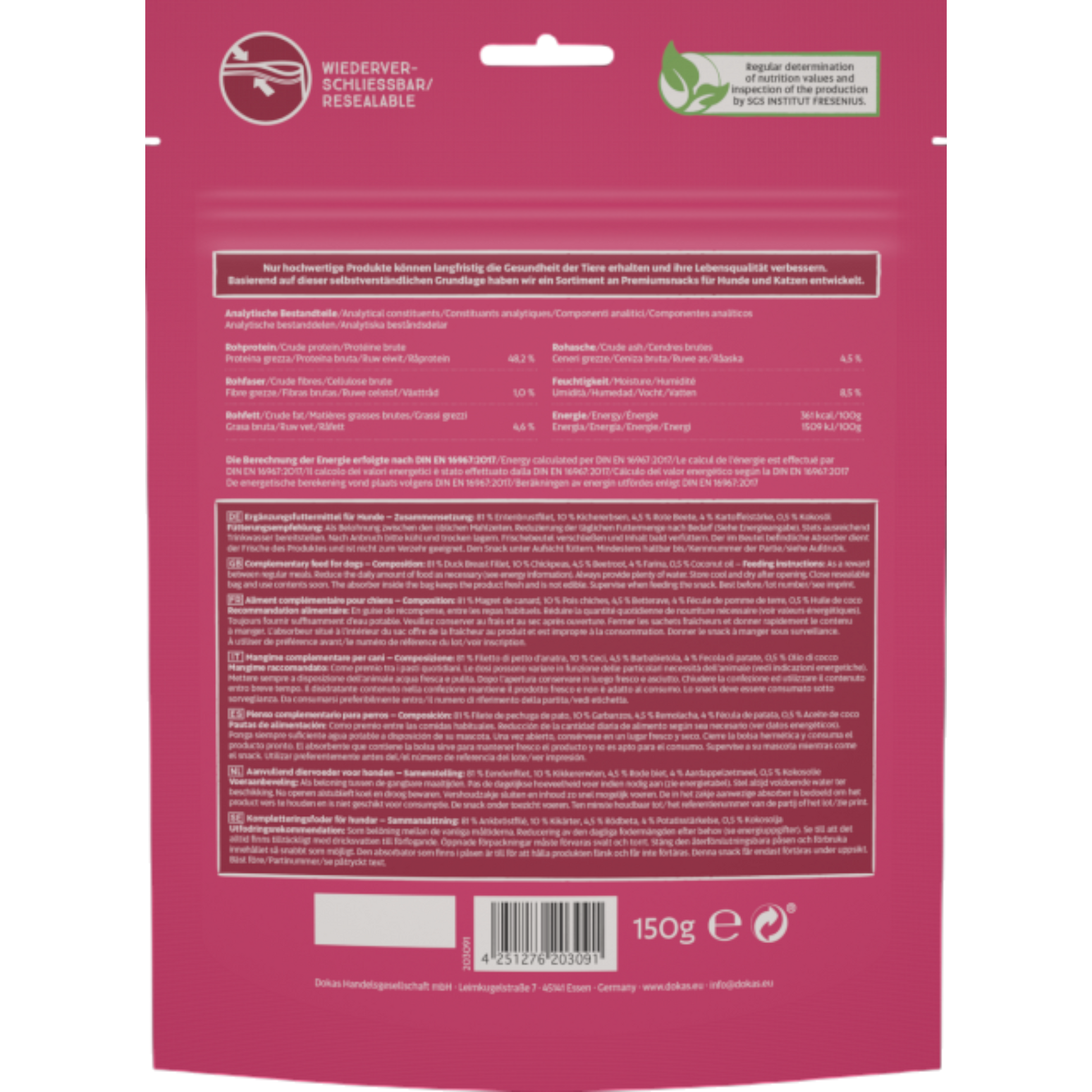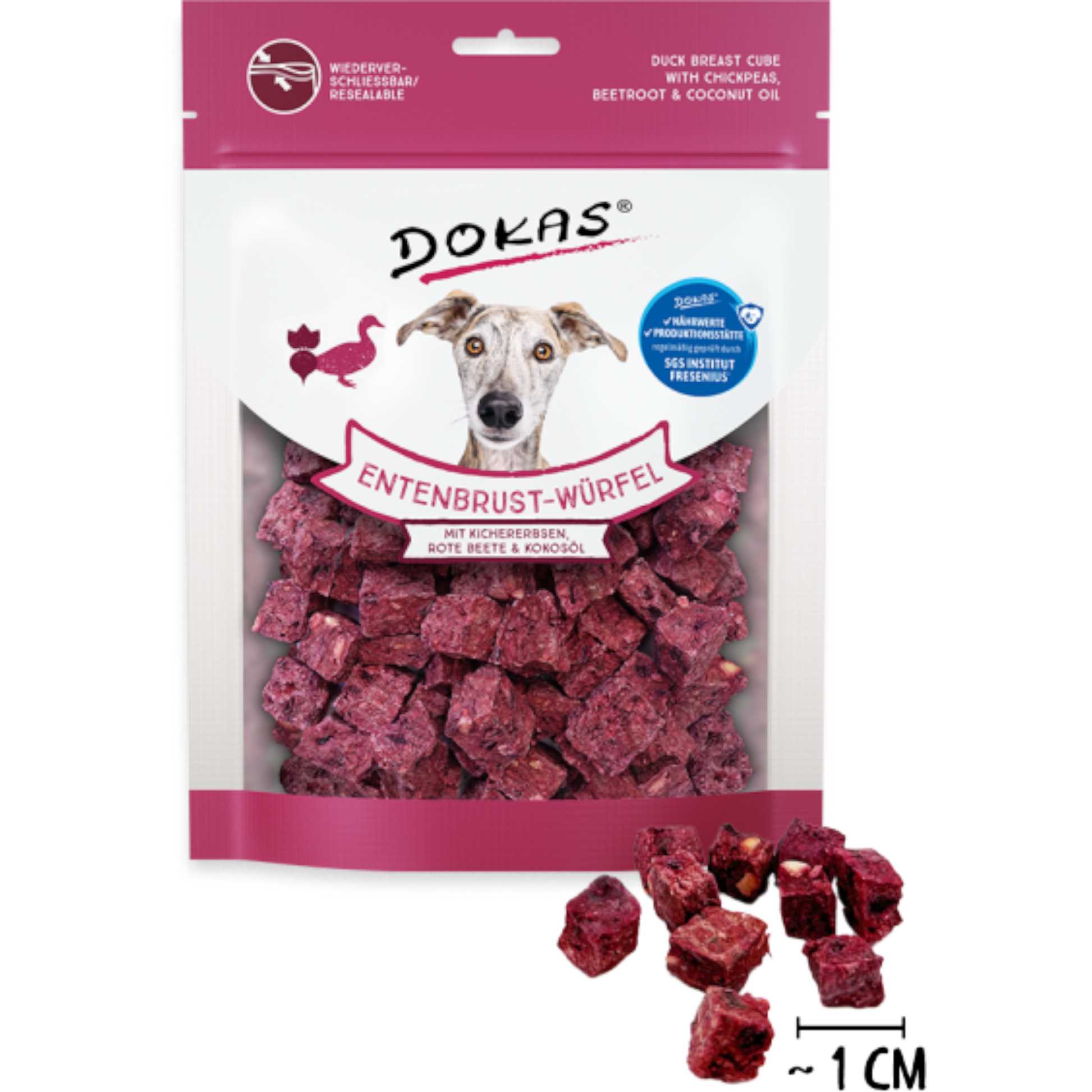 Die Dokas Dog Snack Entenbrust-Würfel mit Kichererbsen vereinen feines, aromatisches Entenbrustfilet mit der sanften, leicht nussigen Note von Kichererbsen. Schonend luftgetrocknet und in praktische Würfelform geschnitten, bieten sie ein intensives Geschmackserlebnis und eine weiche, angenehm kaubare Textur 🐾❤️
