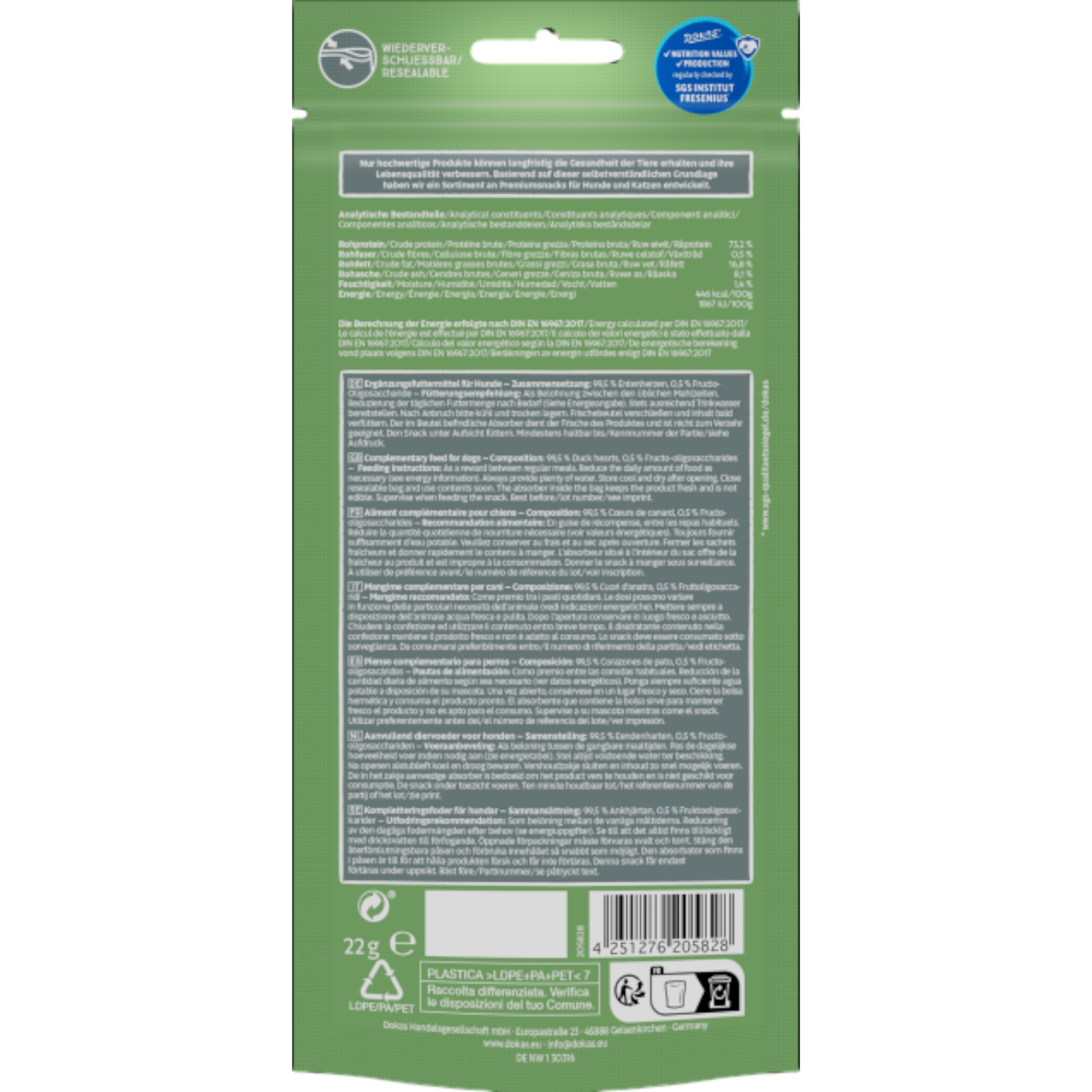 Die Dokas Dog Snack Entenherzen (gefriertrocknet) bestehen aus 100 % natürlichen Entenherzen, die durch ein besonders schonendes Gefriertrocknungsverfahren haltbar gemacht wurden. Dadurch bleiben Aroma, Struktur und wertvolle Nährstoffe nahezu vollständig erhalten – ein Premium-Snack für Hunde, die reine, unverfälschte Fleischsnacks lieben 🐾💛