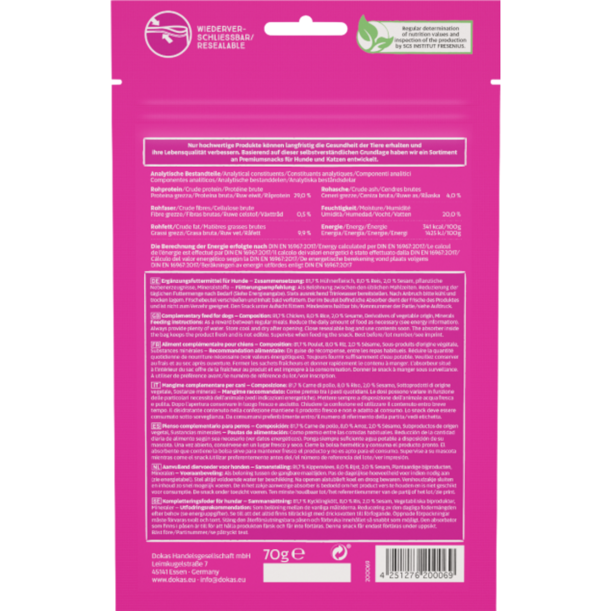 Der Dokas Dog Snack Hühnchen mit Reis & Sesam bietet eine besonders ausgewogene Kombination aus zartem Hühnchenfleisch und ausgewählten pflanzlichen Zutaten. Durch die schonende Lufttrocknung bleibt der natürliche Geschmack erhalten und sorgt für hohe Akzeptanz – ideal auch für wählerische Hunde 🐔✨