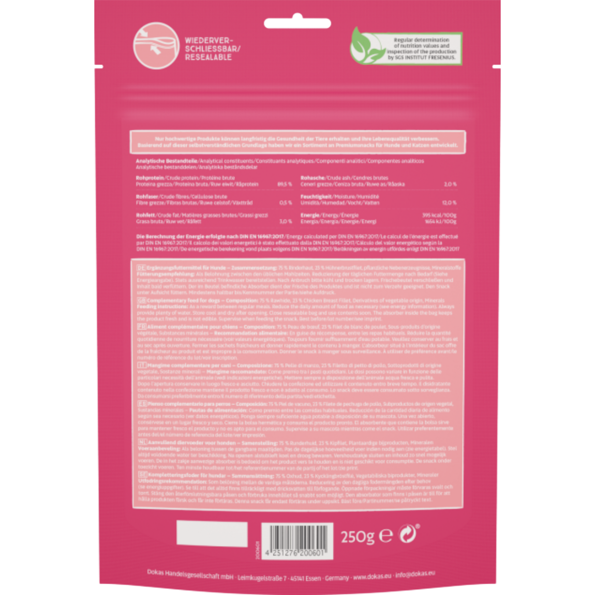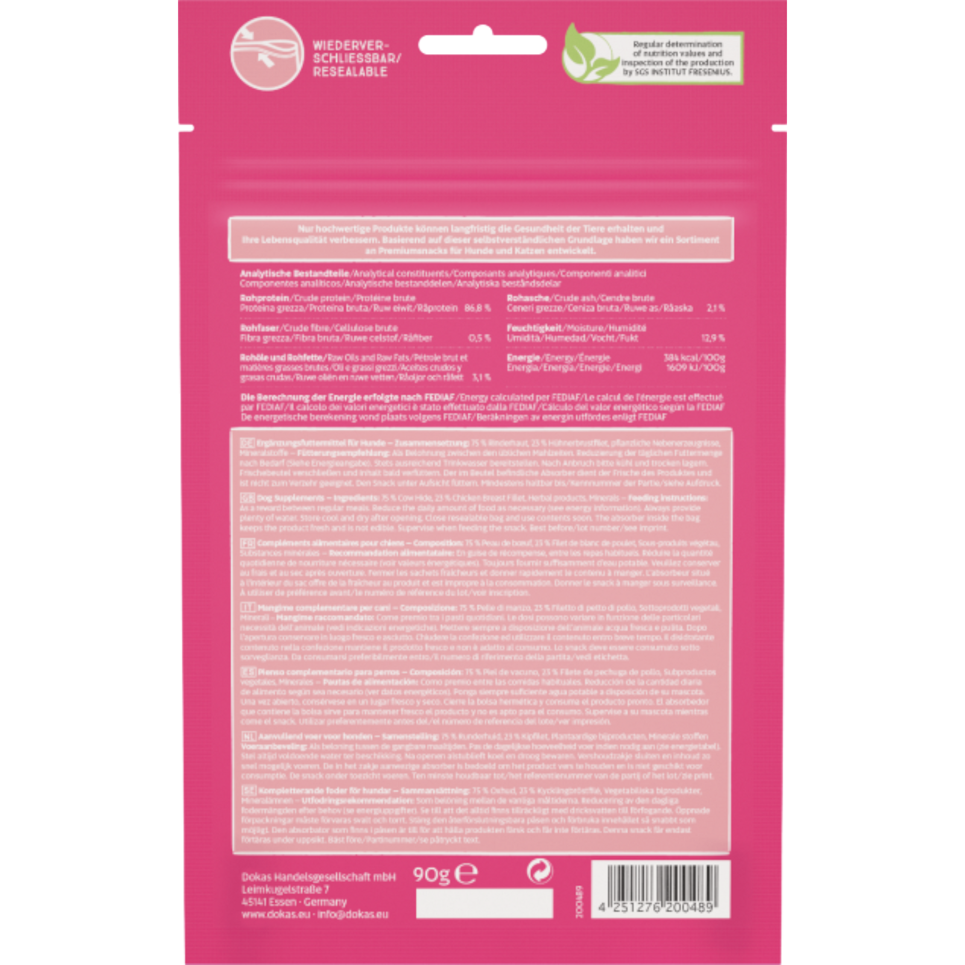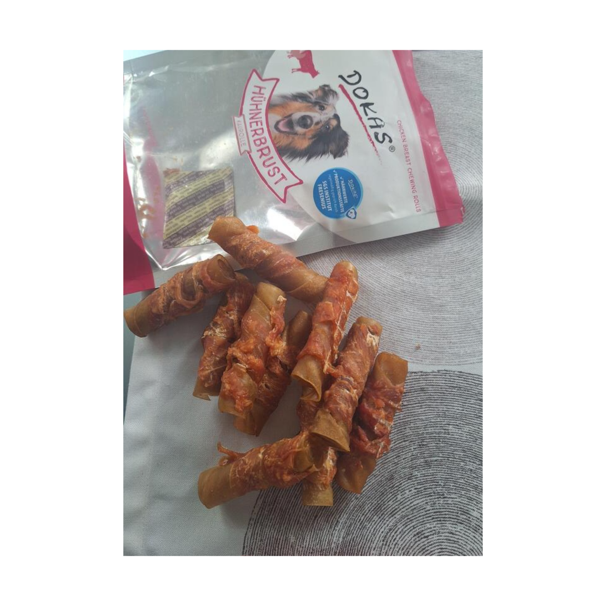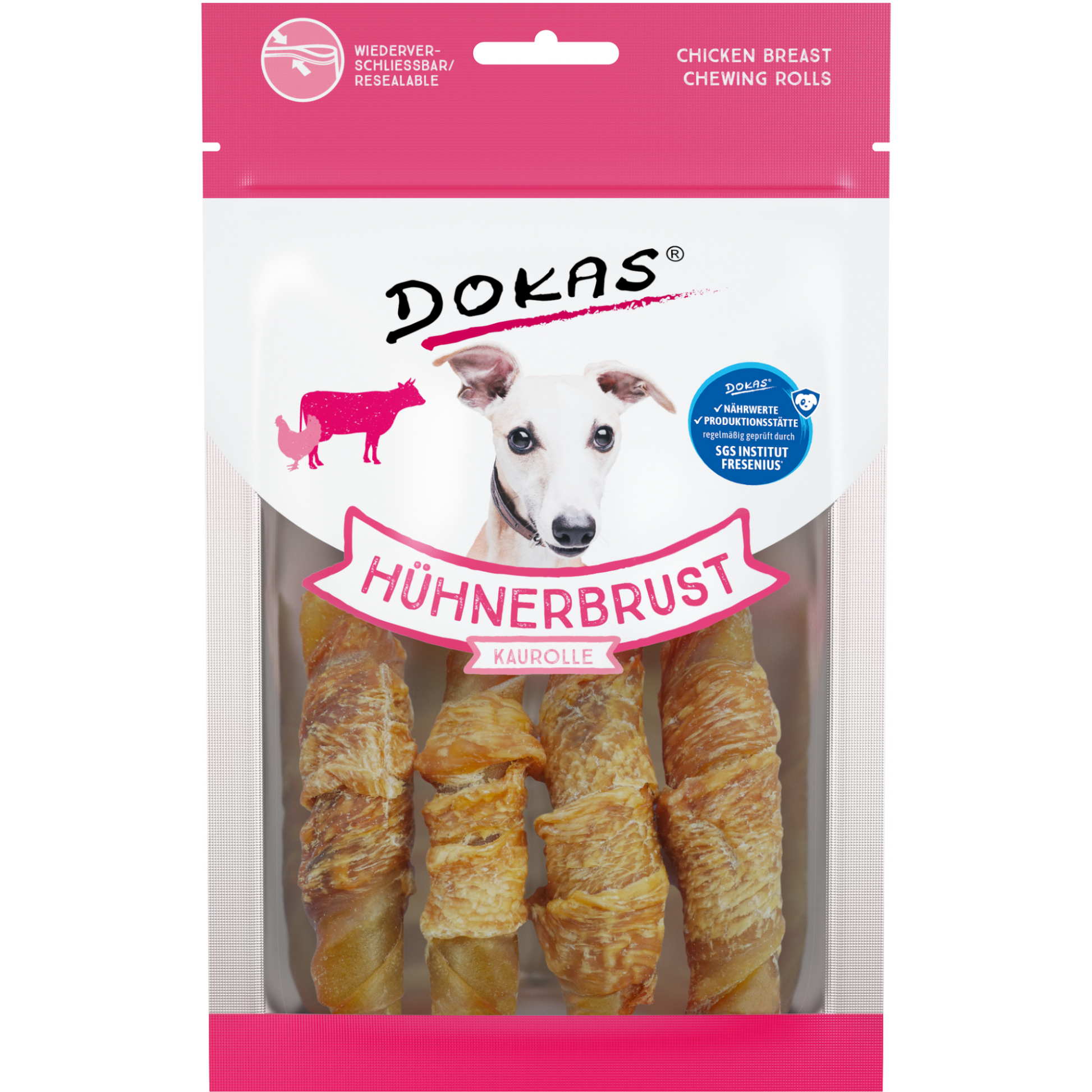 Die Dokas Dog Snack Hühnerbrust Kaurolle kombiniert zwei Highlights in einem Snack: eine feste, knackige Kaustange aus Rinderhaut wird von zarter Hühnerbrust umwickelt und anschließend schonend luftgetrocknet. Das Ergebnis ist ein besonders schmackhafter Kauartikel, der gleichzeitig die Kaumuskulatur stärkt und den natürlichen Kautrieb fördert 🐶✨