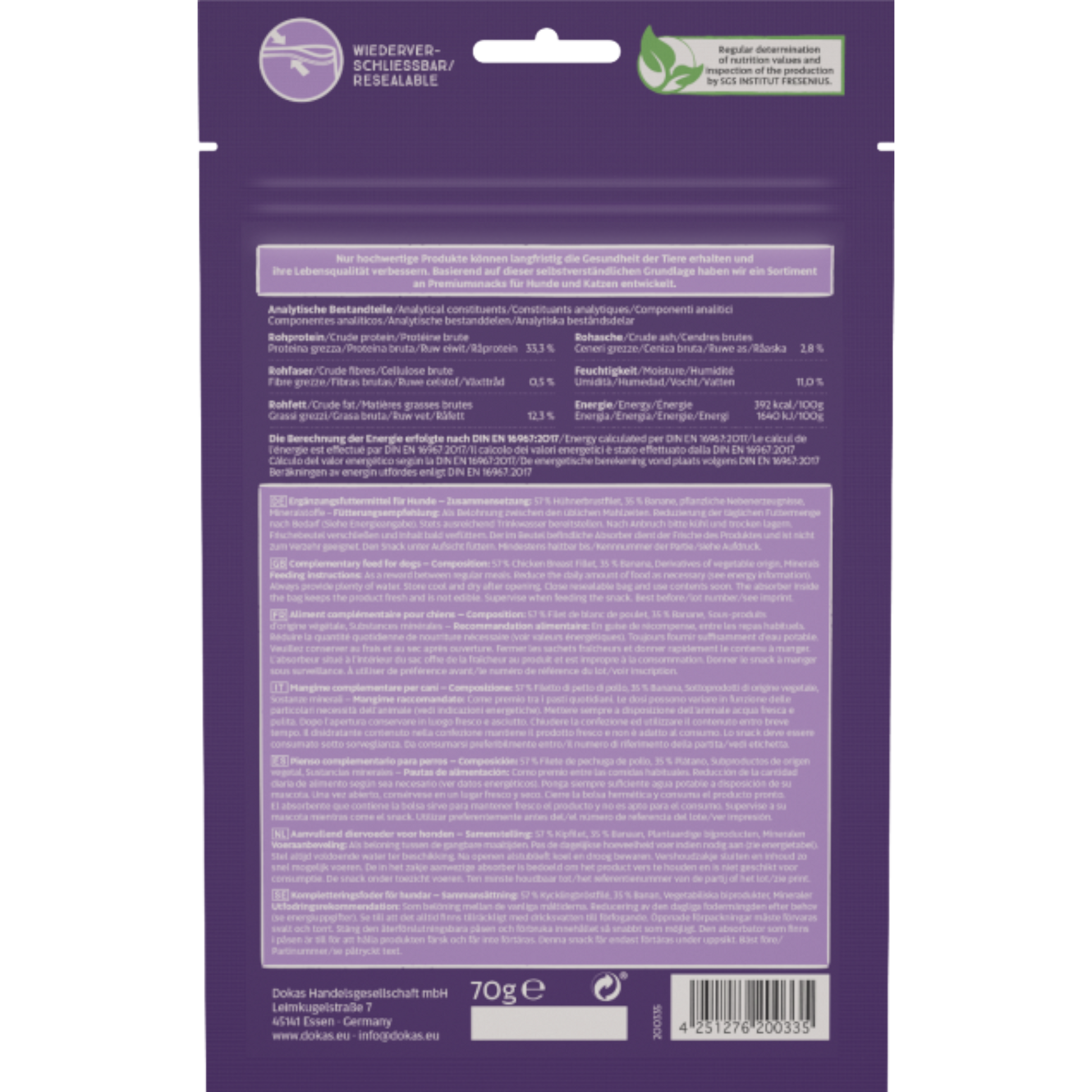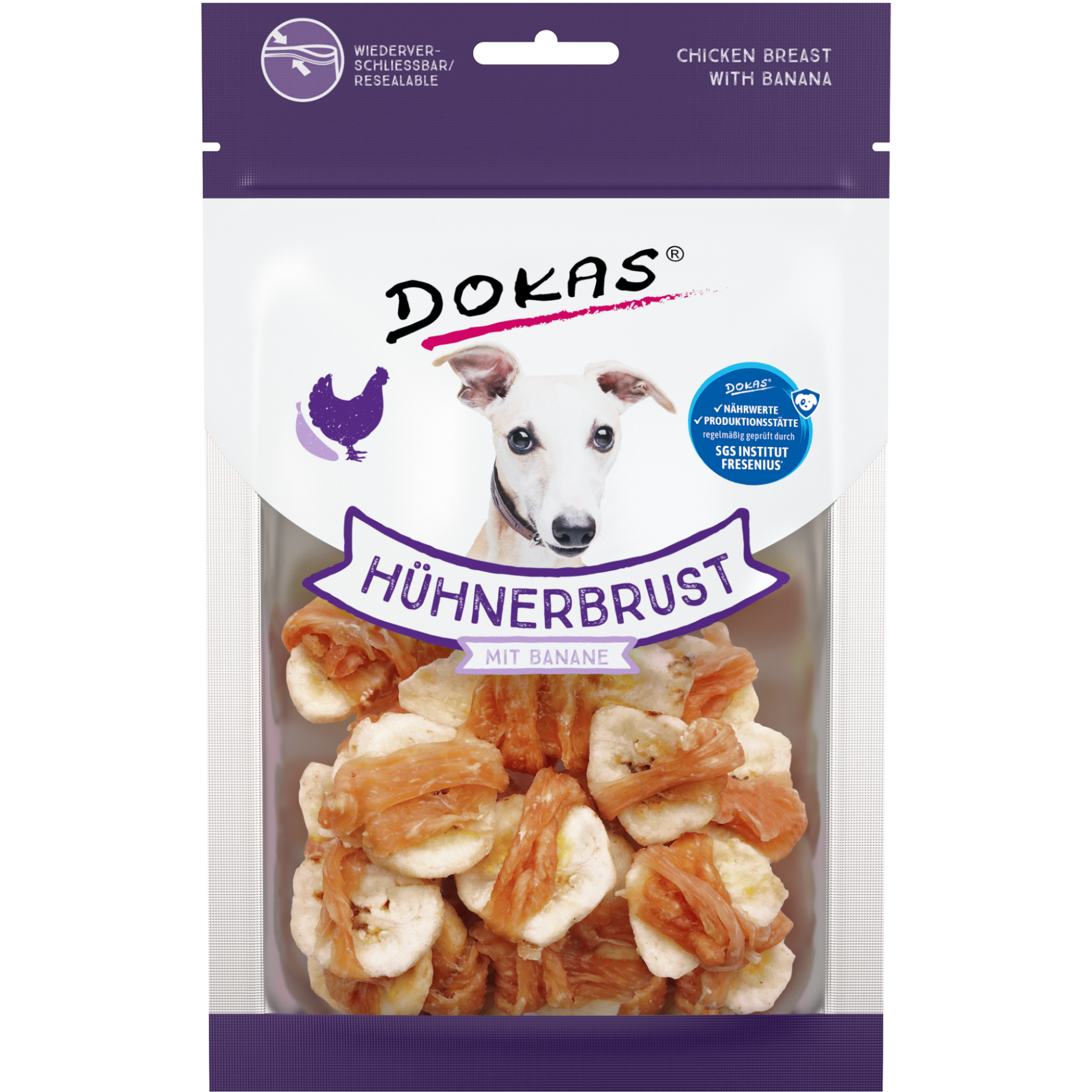 Die Dokas Dog Snack Hühnerbrust mit Banane Stückchen bieten eine köstliche Kombination aus feinem Hühnerbrustfilet und natürlicher Banane. Durch die schonende Lufttrocknung bleibt der volle Geschmack erhalten – ein unwiderstehlicher Mix aus herzhafter Fleischqualität und süßer Fruchtnote, der Hunde immer wieder begeistert 🐔✨🍌