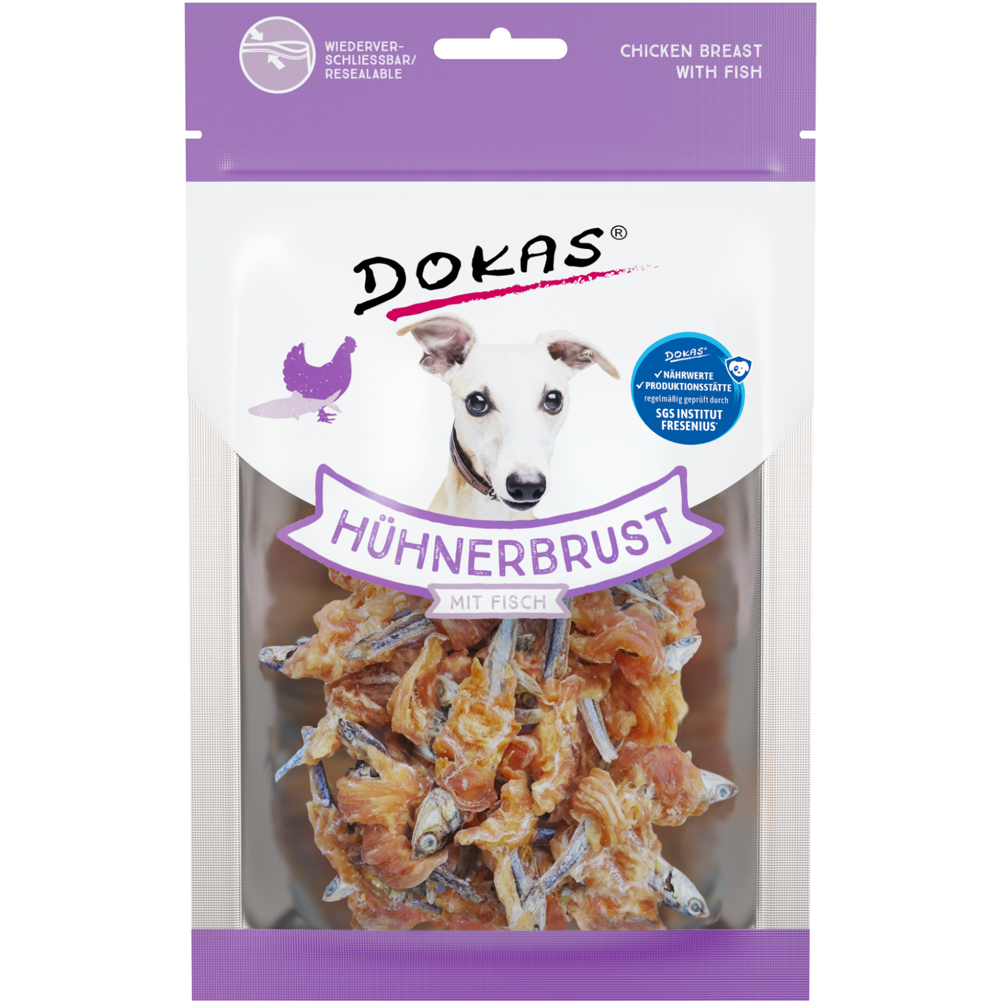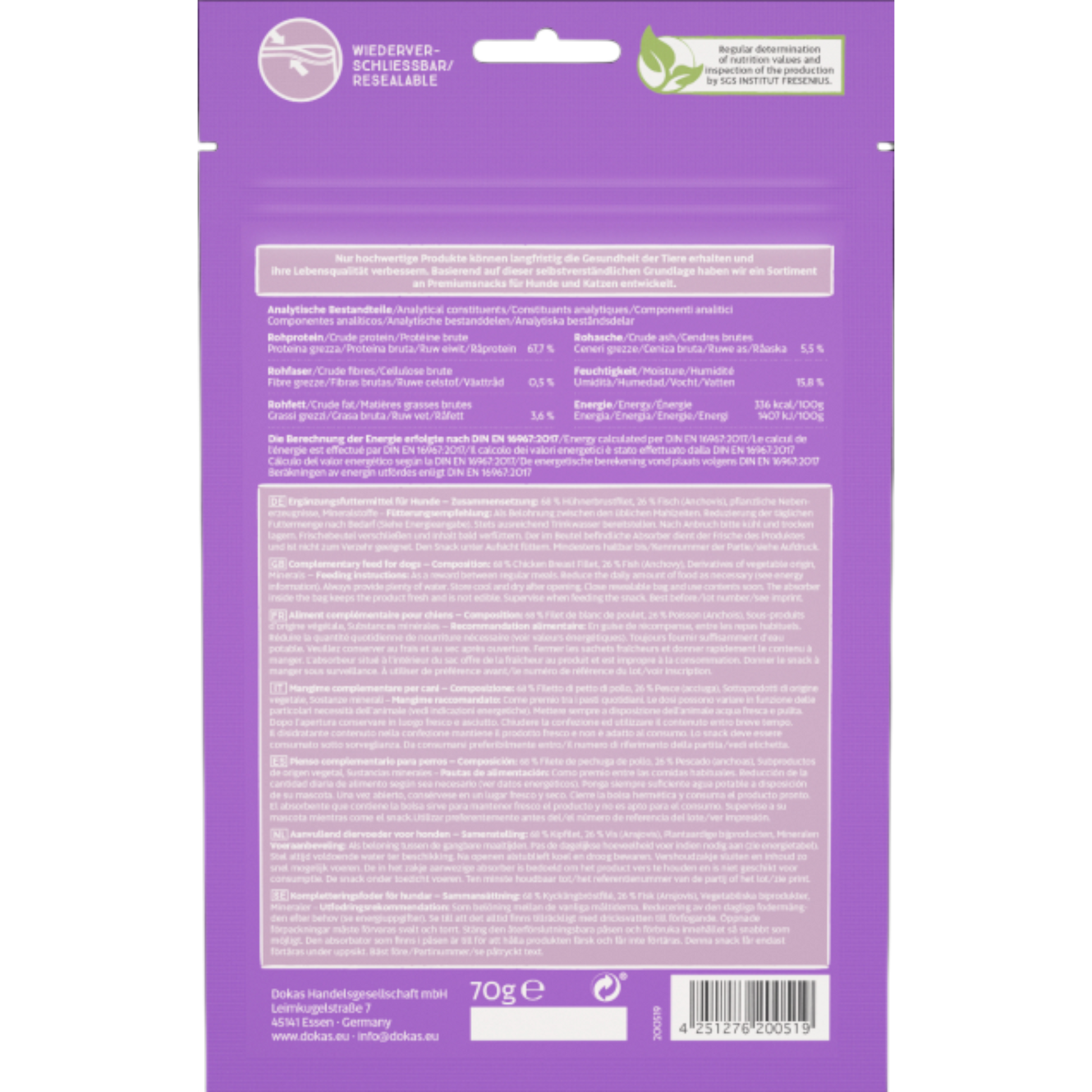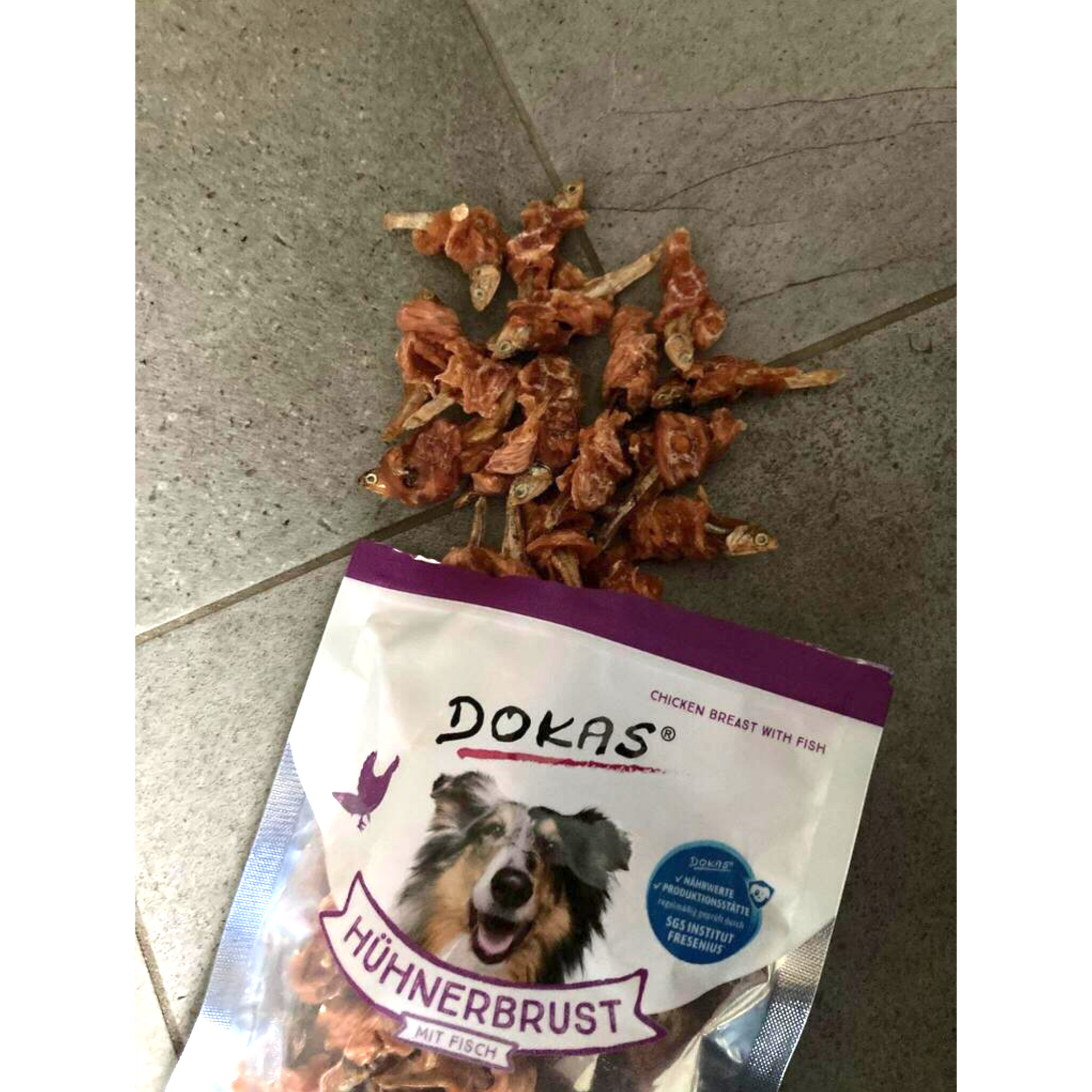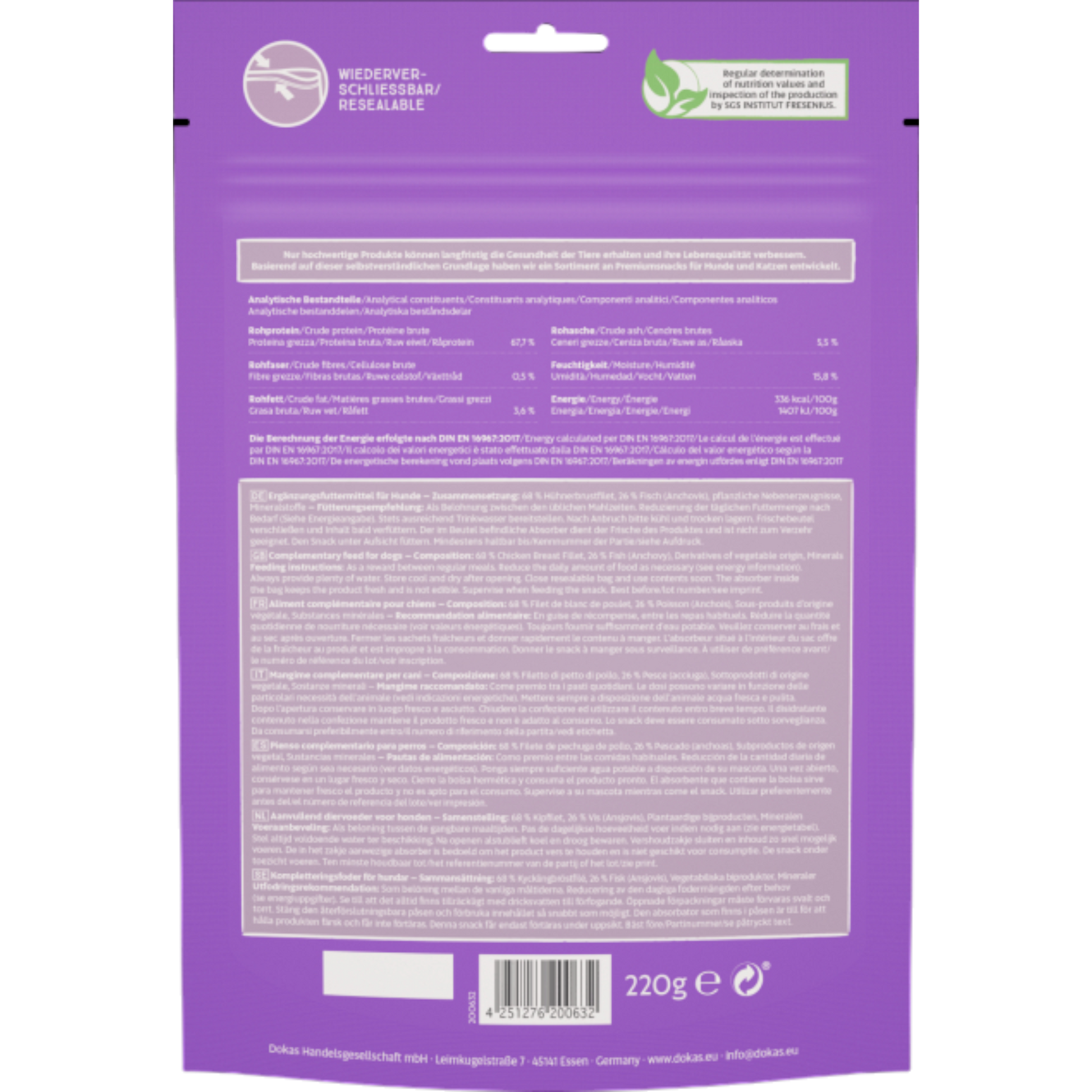 Die Dokas Dog Snack Hühnerbrust mit Fisch Stückchen bieten eine besonders ausgewogene Kombination aus zartem Hühnerbrustfilet und hochwertigem Fisch. Durch die schonende Lufttrocknung bleiben Aroma, Geschmack und wertvolle Nährstoffe erhalten – ein doppelter Genuss, der Hunde aller Größen und Altersstufen begeistert 🐾✨