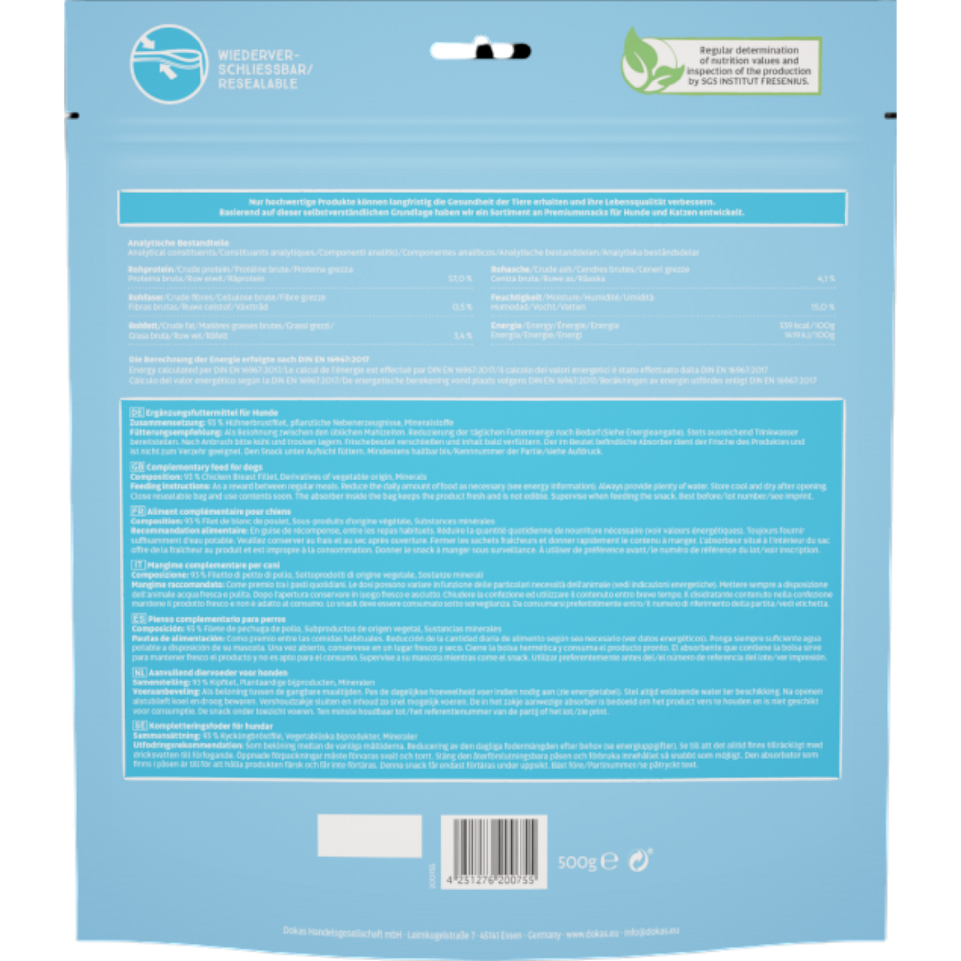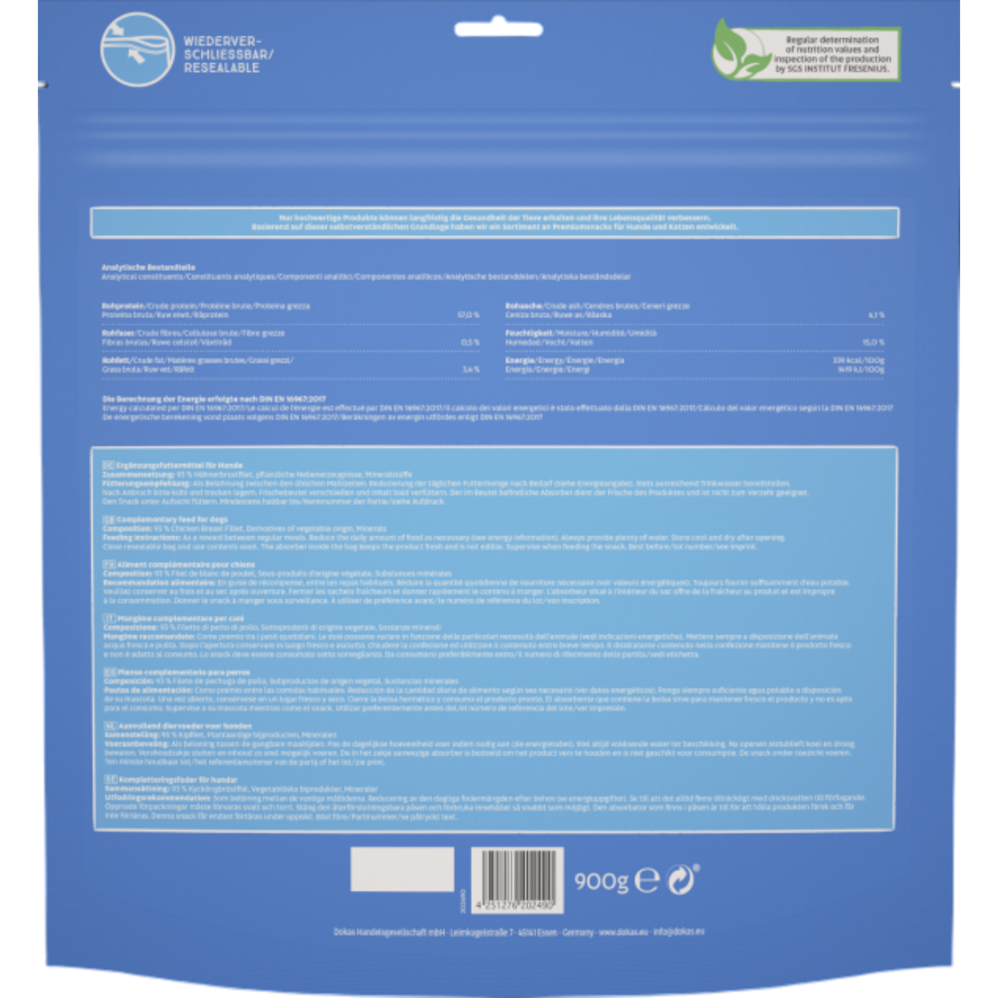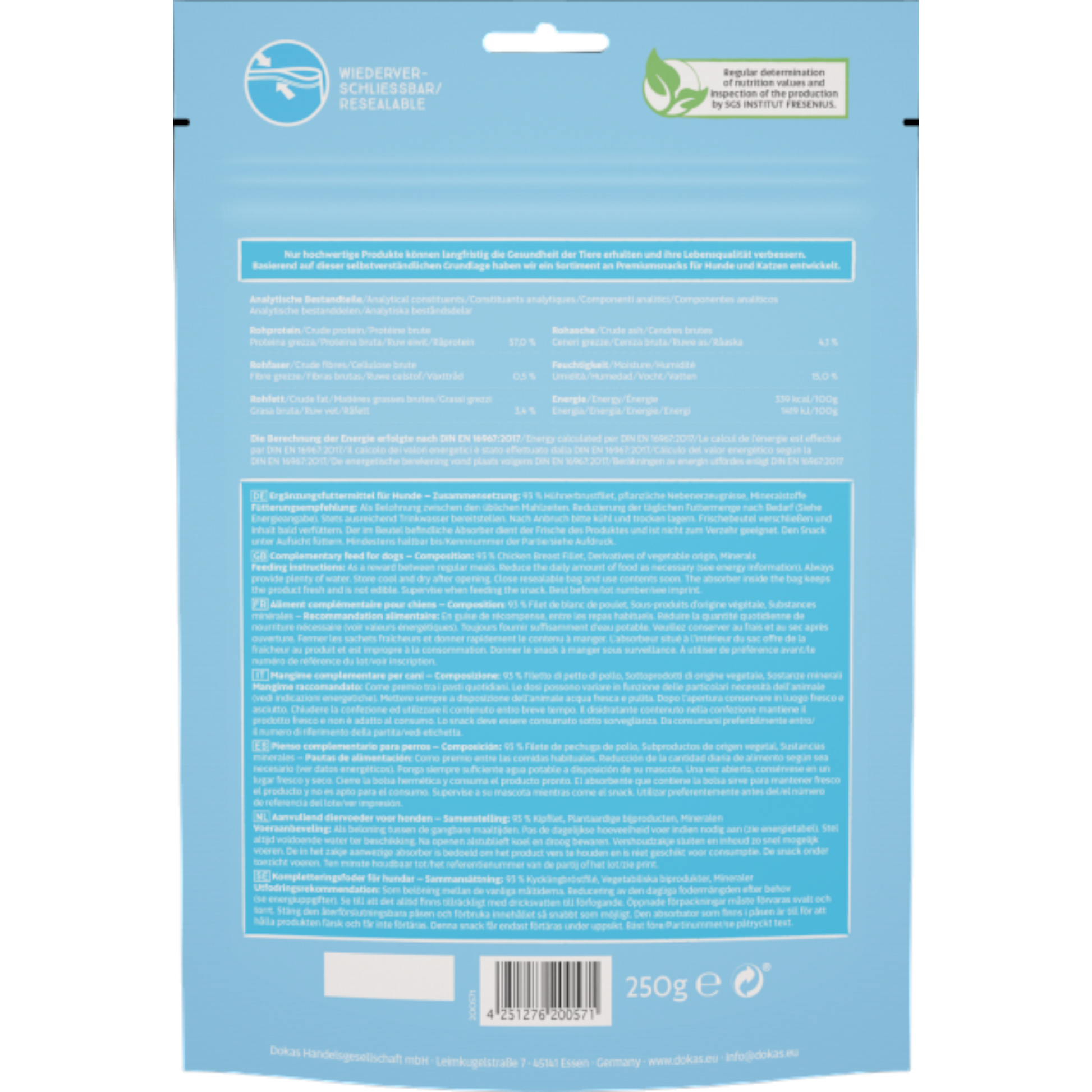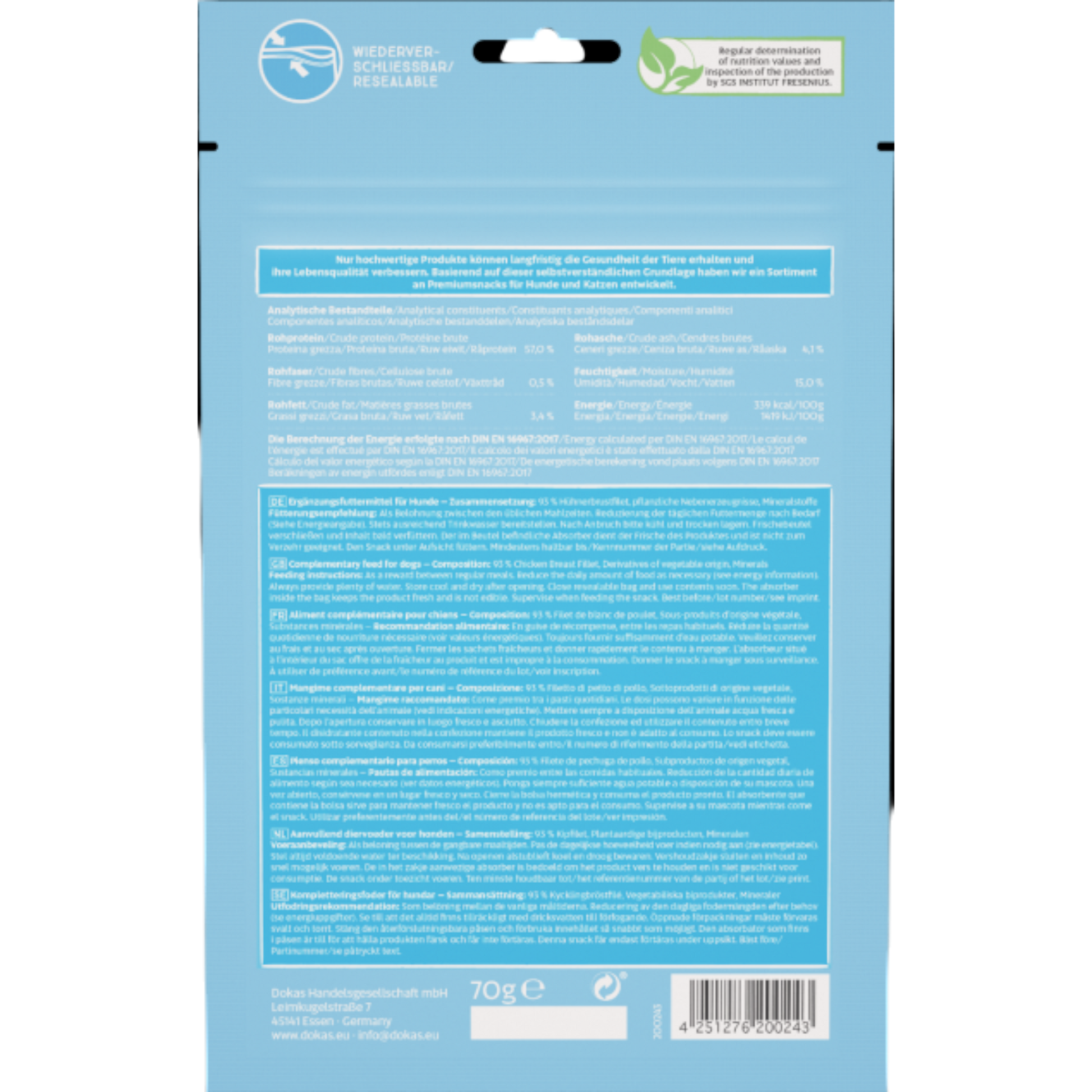 Die Dokas Dog Snack Hühnerbrust Streifen sind ein hochwertiger, naturbelassener Snack für Hunde aller Rassen und Größen. Sie bestehen aus sorgfältig ausgewähltem Hühnerbrustfilet und werden besonders schonend luftgetrocknet. Dadurch bleiben Geschmack, Nährstoffe und die natürliche Fleischstruktur optimal erhalten – für höchste Akzeptanz selbst bei wählerischen Hunden 🐾✨