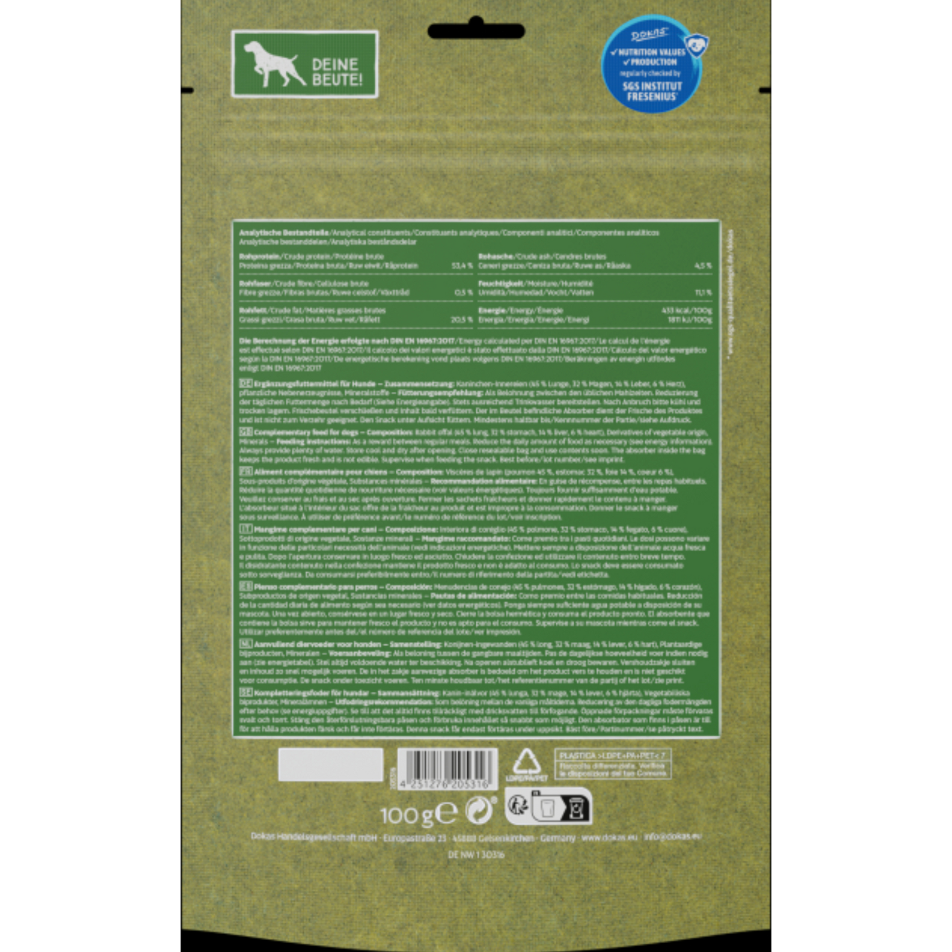Die Dokas Dog Snack Kaninchen-Innereien bieten ein besonders natürliches und hochverträgliches Geschmackserlebnis. Die Mischung aus Lunge, Magen, Leber und Herz vom Kaninchen wird schonend getrocknet und bewahrt dadurch ihr volles Aroma sowie wertvolle Nährstoffe 🐾💛