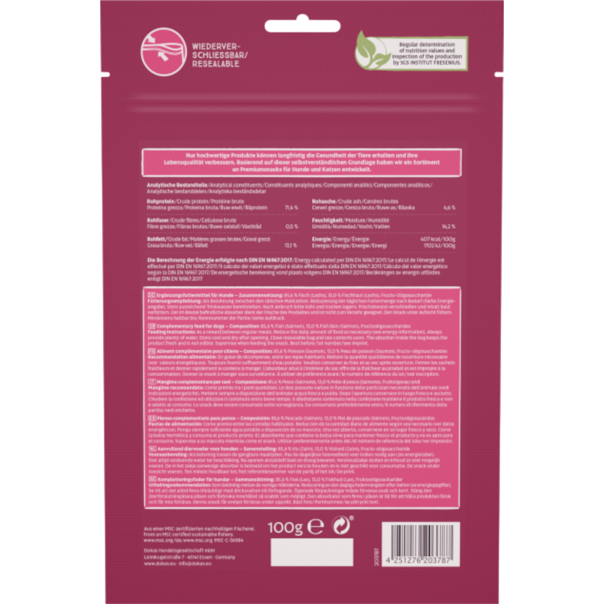 Die Dokas Dog Snack Lachs Streifen bestehen aus hochwertigem, schonend luftgetrocknetem Lachs und bieten einen natürlichen, aromatischen Snack für Hunde, die Fisch lieben. Durch ihre weiche, aber dennoch angenehm feste Konsistenz eignen sich die Streifen hervorragend als Belohnung, Trainingssnack oder kleine Zwischenmahlzeit 🐾💛