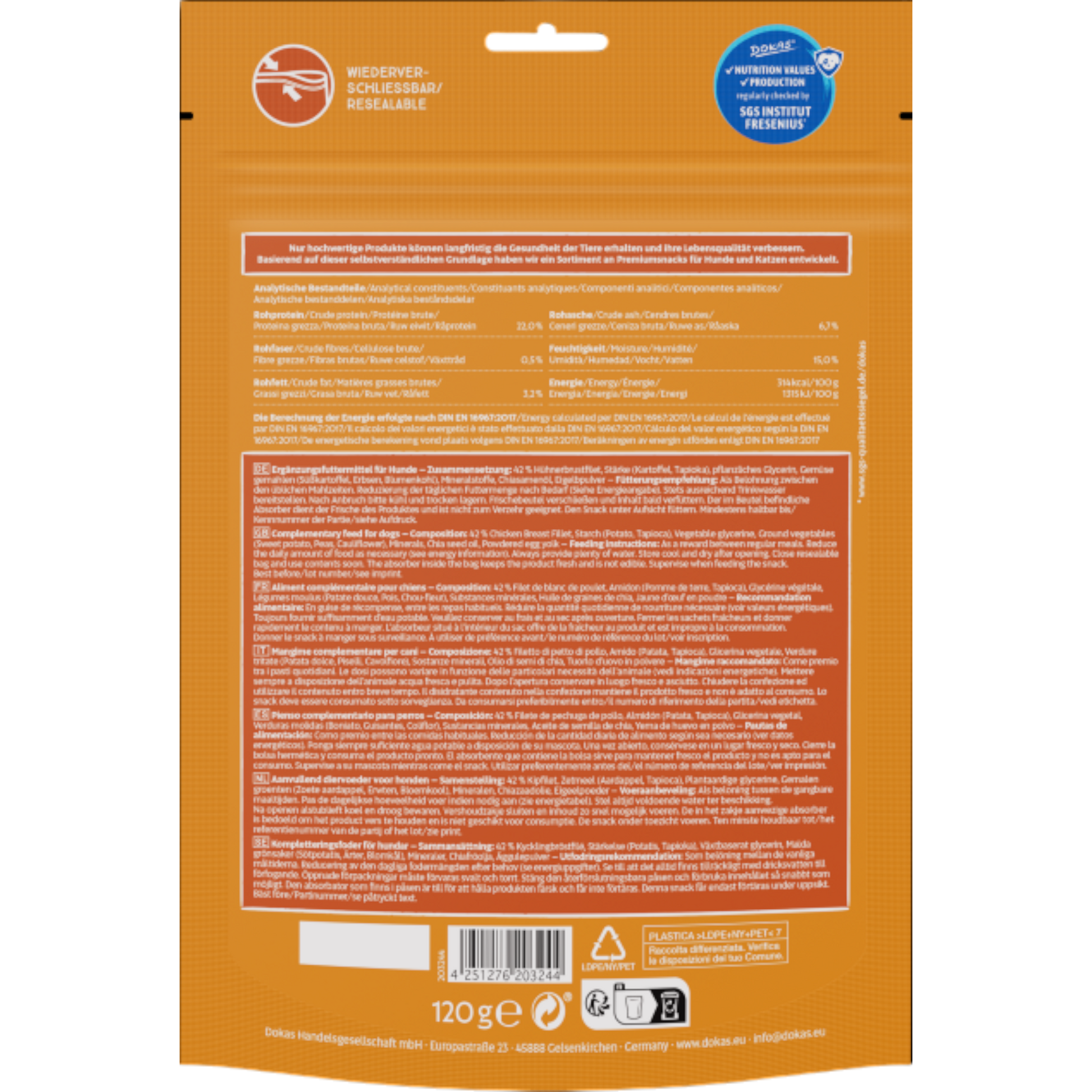 Die Dokas Dog Snack Löckchen mit Hühnerbrust sind besonders zarte, leicht gewellte Fleischstreifen aus feinem Hühnerbrustfilet. Durch ihre luftige Form und die schonende Trocknung entwickeln sie ein intensives Aroma, das Hunde sofort begeistert 🐾💛