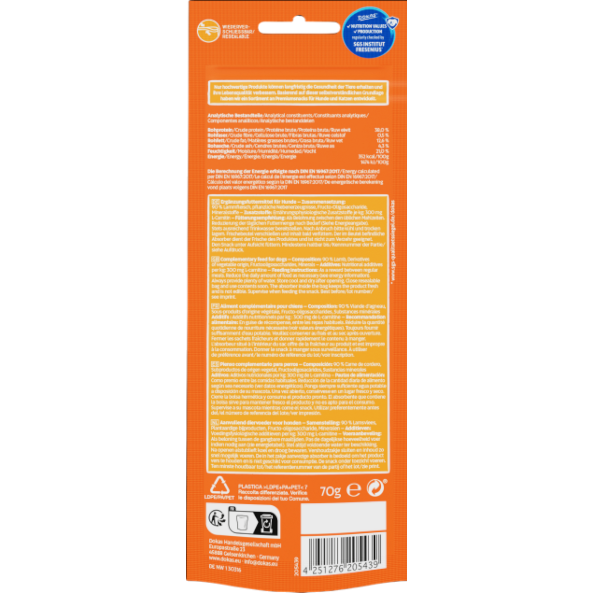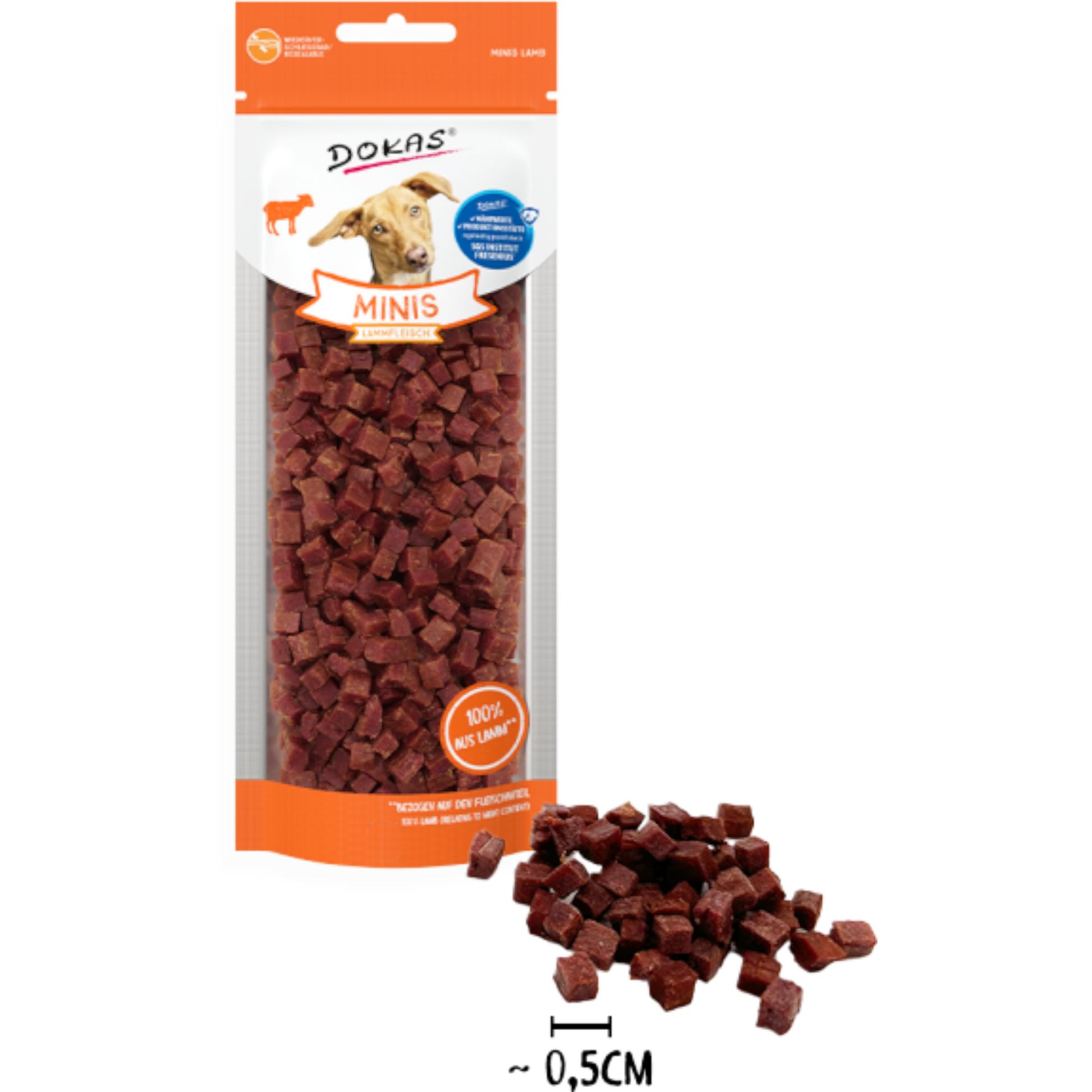 Die Dokas Dog Snack Minis Lammfleisch bestehen aus kleinen, besonders weichen und aromatischen Stückchen aus hochwertigem Lammfleisch. Dank der milden, gut verträglichen Rezeptur eignen sich die Minis hervorragend für Hunde mit Allergien, sensibler Verdauung oder als alternative Proteinquelle im Trainingsalltag 🐾💛