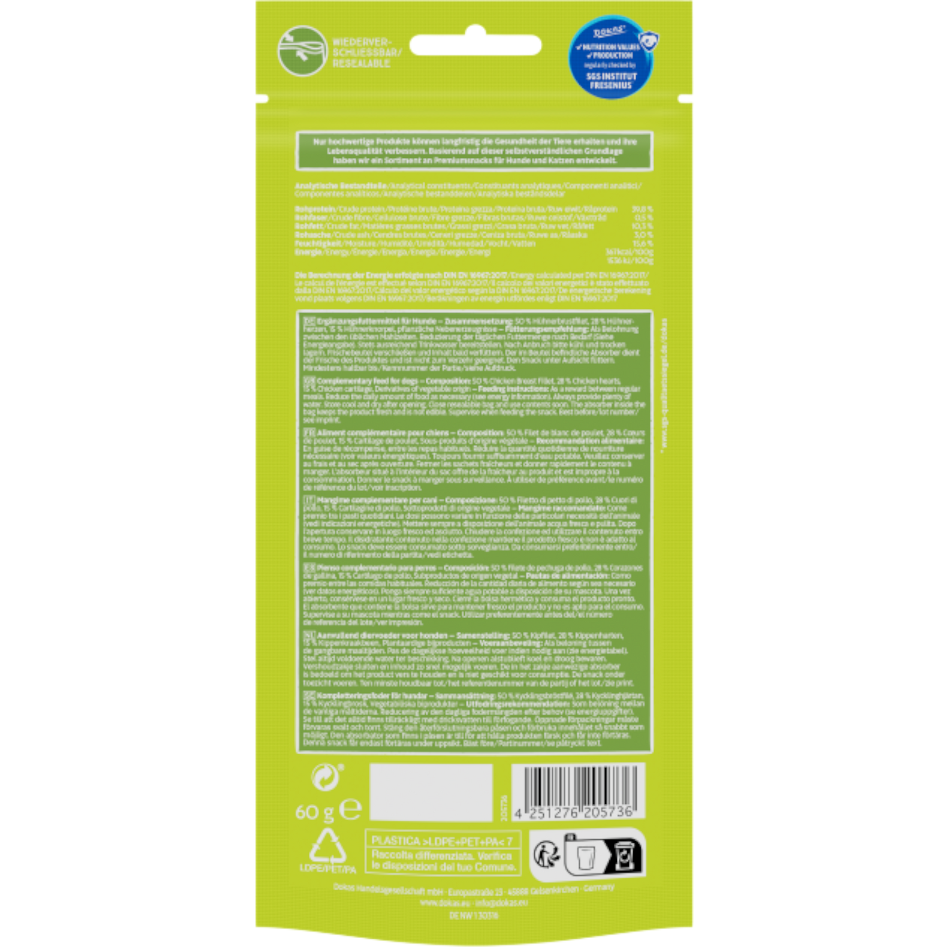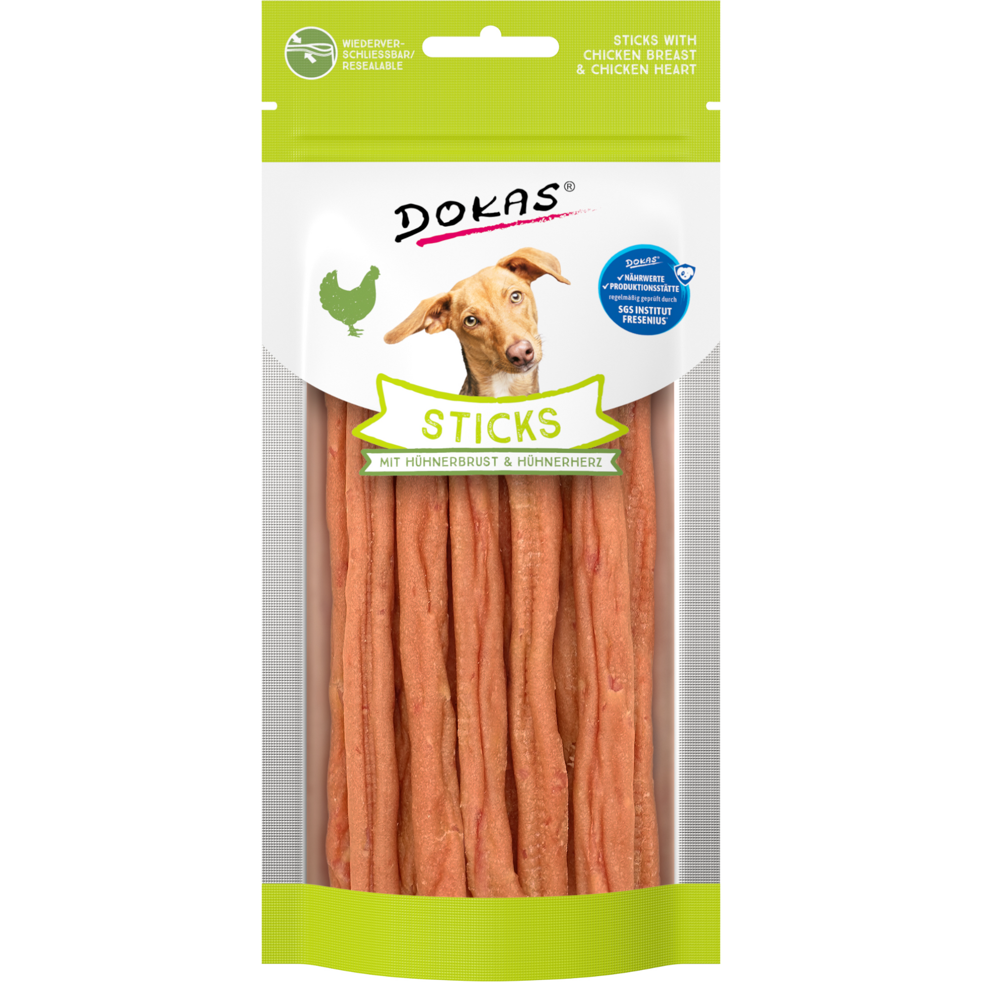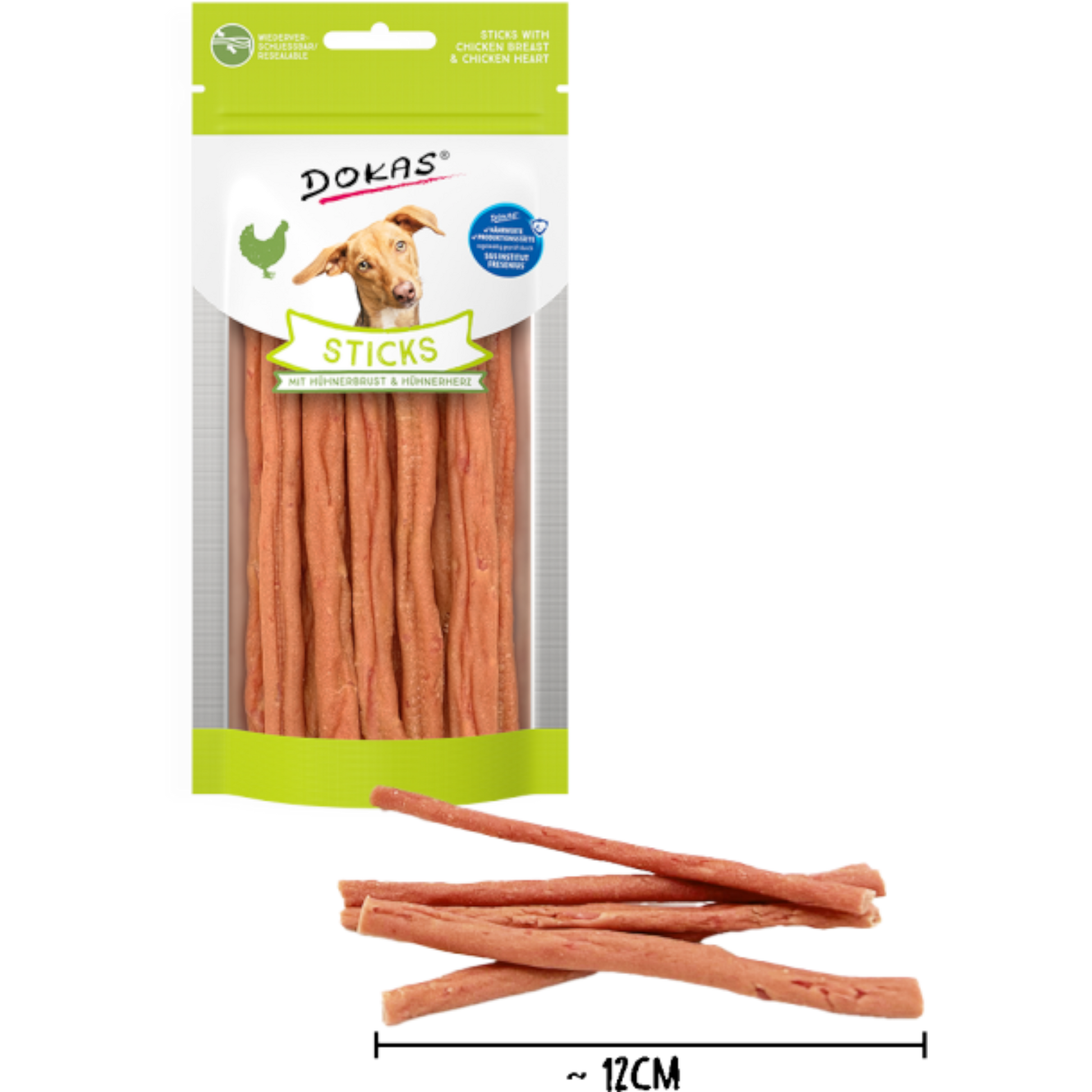Die Dokas Dog Snack Sticks mit Hühnerbrust + Hühnerherz bieten eine besonders aromatische und nährstoffreiche Kombination aus zartem Hühnerfleisch und natürlichem Hühnerherz. Die Sticks sind weich, gut kaubar und reich an tierischen Proteinen, was sie zu einem idealen Snack für Training, Belohnung oder zwischendurch macht 🐾💛