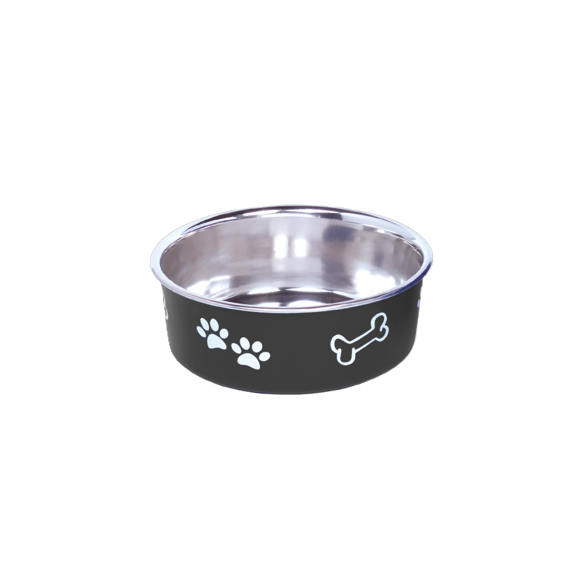Der "Fusion" Edelstahlnapf ist robust, leicht zu reinigen und rutschfest, sodass dein Hund in Ruhe fressen kann, ohne dass der Napf verrutscht. Die moderne Optik mit Pfoten- & Knochenmotiven macht ihn zu einem echten Blickfang in jeder Futterecke.