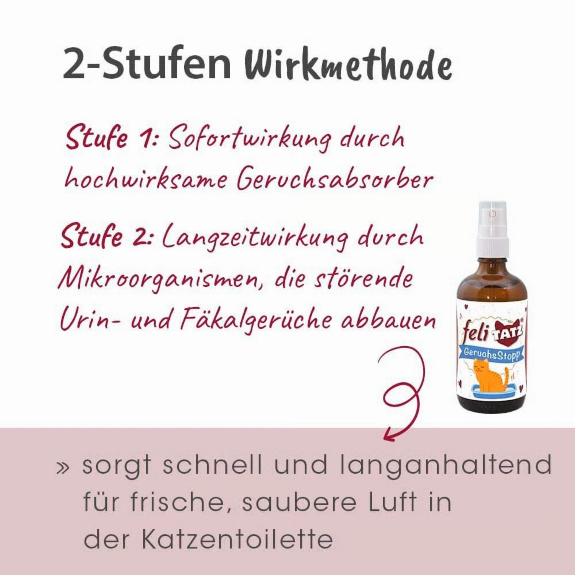 Der feliTATZ GeruchsStopp sorgt für frische, saubere Luft rund um die Katzentoilette und neutralisiert unangenehme Gerüche von Urin und Kot besonders effektiv. Statt Gerüche lediglich zu überdecken, setzt dieses hochwertige Reinigungsspray auf eine intelligente 2-Stufen-Wirkmethode, die Geruchsursachen gezielt beseitigt 🐱🚿