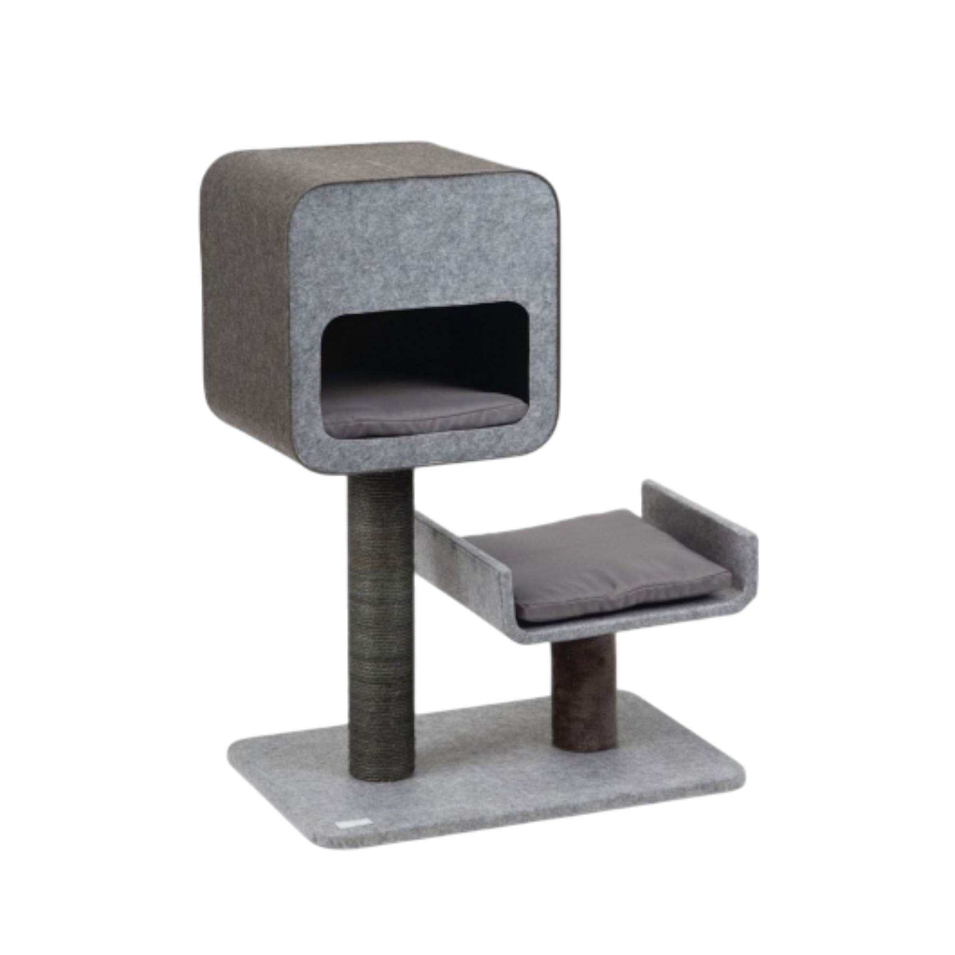 Die hochwertige Filzverarbeitung in zeitlosen Grautönen verleiht dem Kratzbaum eine elegante, puristische Optik, die sich harmonisch in nahezu jedes Wohnkonzept einfügt. Von der Liegefläche aus behält Ihre Katze ihr Revier im Blick, während die Höhle einen geschützten Rückzugsort für erholsame Ruhephasen bietet.