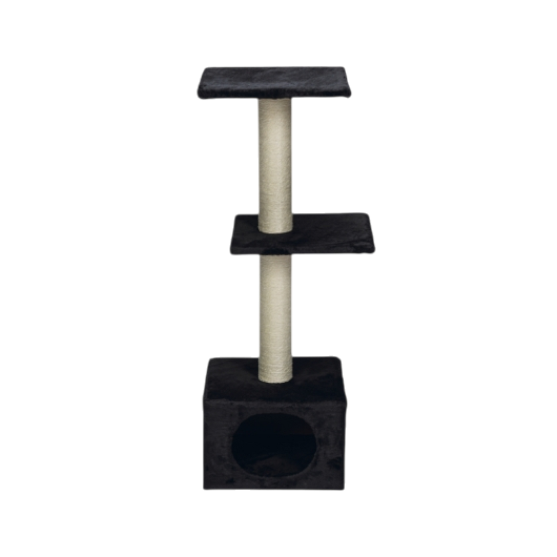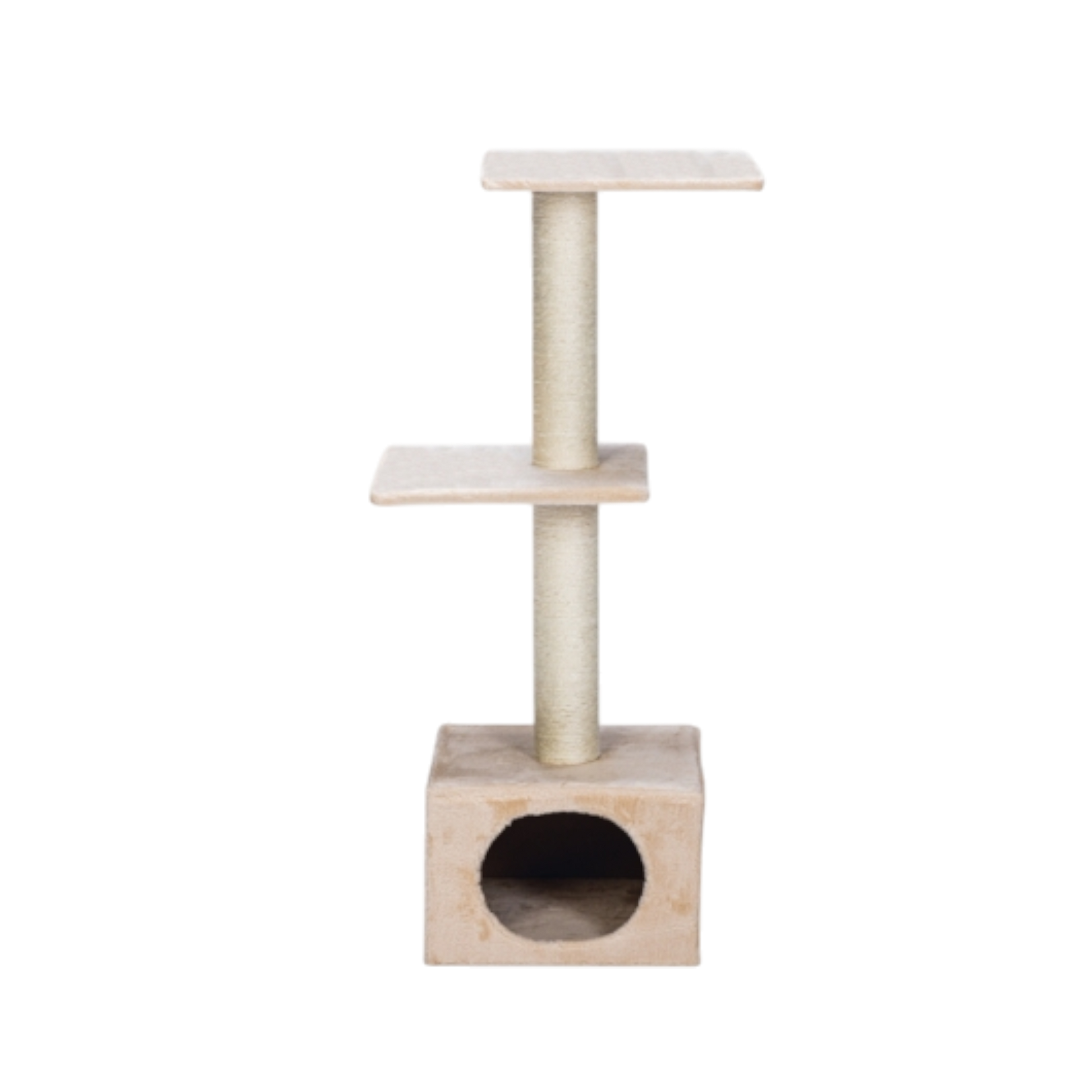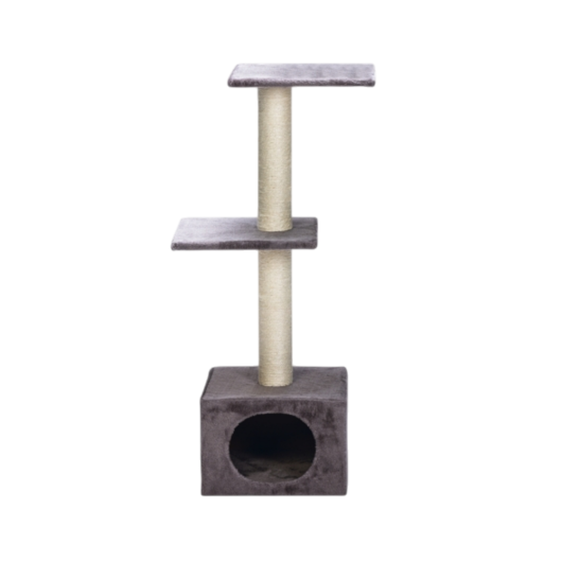 Die weich mit Plüsch bezogene Höhle lädt zum Verstecken und Schlafen ein, während die zwei großzügigen Liegeflächen perfekte Aussichtspunkte zum Beobachten bieten. Die stabilen Sisal-Stämme ermöglichen ausgiebiges Kratzen und unterstützen die natürliche Krallenpflege. So bleibt dein Zuhause geschützt – und deine Katze glücklich.