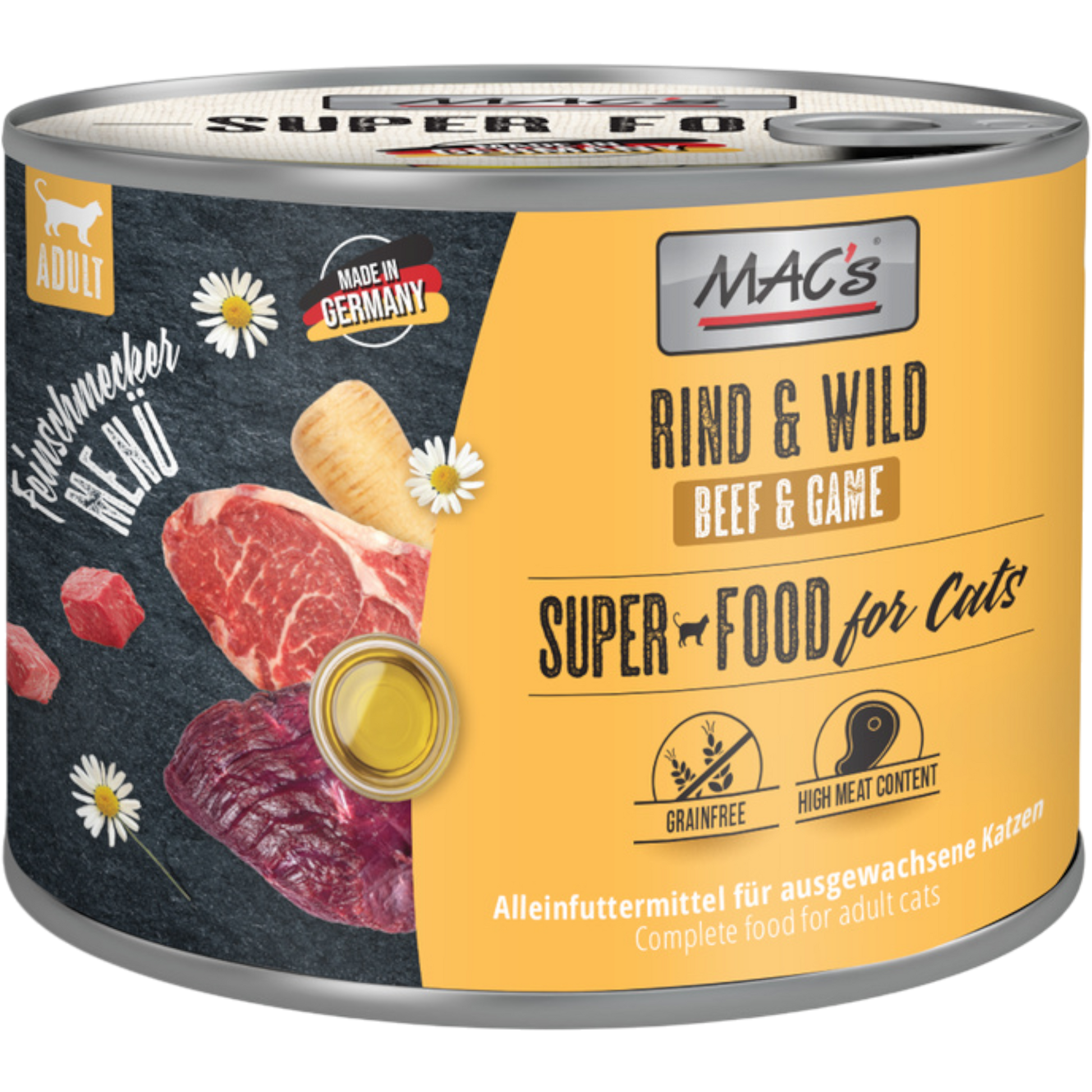Dieses hochwertige Nassfutter von MAC’s bietet deiner Katze ein intensives Geschmackserlebnis aus kräftigem Rind und feinem Wild. Ergänzt durch ausgewählte pflanzliche Komponenten wie Pastinake, Leinöl und Kamille entsteht eine besonders ausgewogene, naturnahe Rezeptur – selbstverständlich getreidefrei und ohne pflanzliche Kohlenhydrate.
