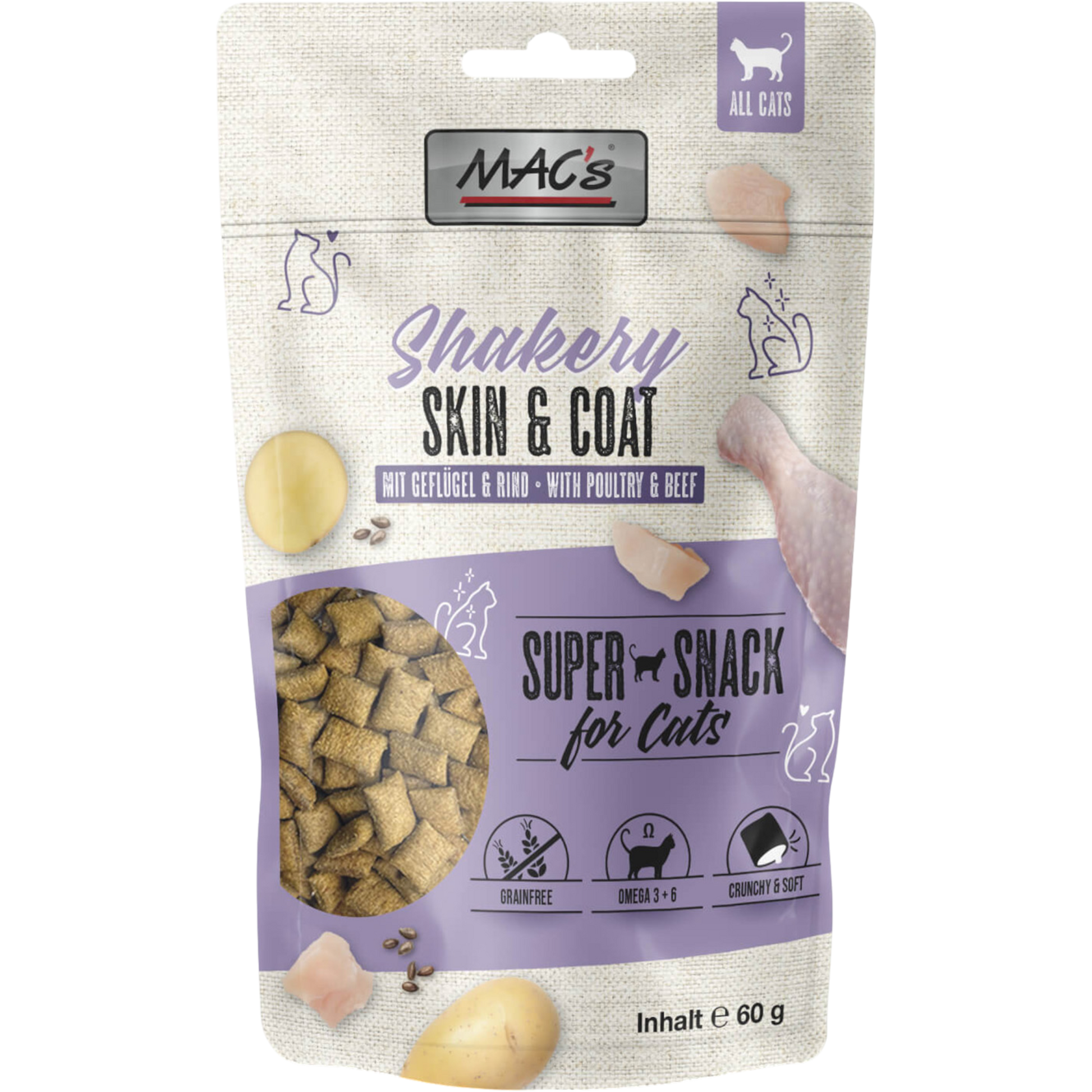 Dieser funktionale Snack kombiniert hohen Genuss mit gezielter Unterstützung für Haut und Fell. Die knusprigen Shakery Snacks Skin & Coat überzeugen mit einer zart-cremigen Füllung aus Geflügel und Rind und sind speziell darauf ausgelegt, das äußere Erscheinungsbild deiner Katze von innen heraus zu fördern.