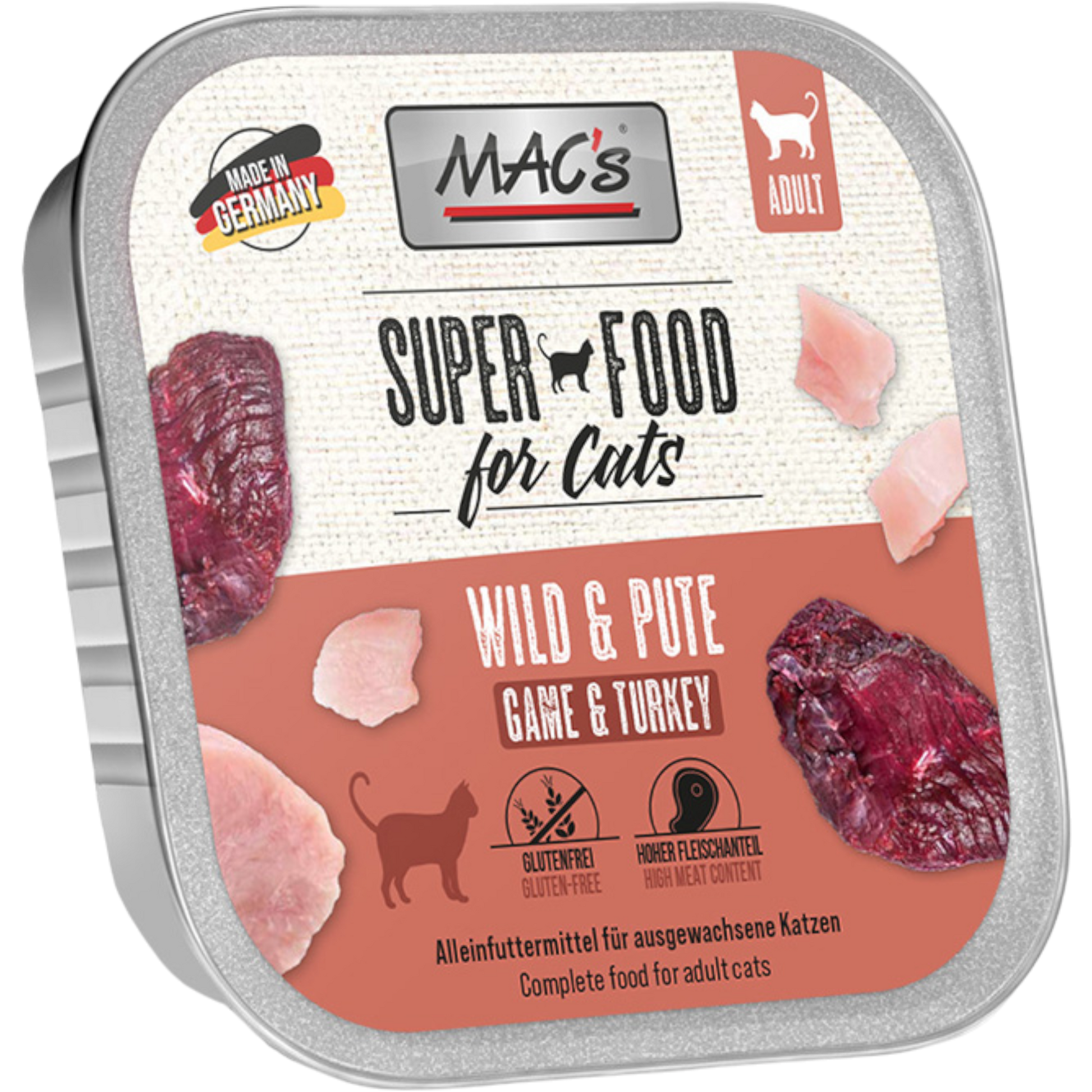 Diese getreidefreie Katzennahrung von MAC's kombiniert zarte Pute mit aromatischem Wild zu einer ausgewogenen, herzhaften Mahlzeit. Zwei hochwertige Fleischsorten liefern deiner Katze wertvolle Proteine und sorgen für natürlichen Geschmack mit hoher Akzeptanz.