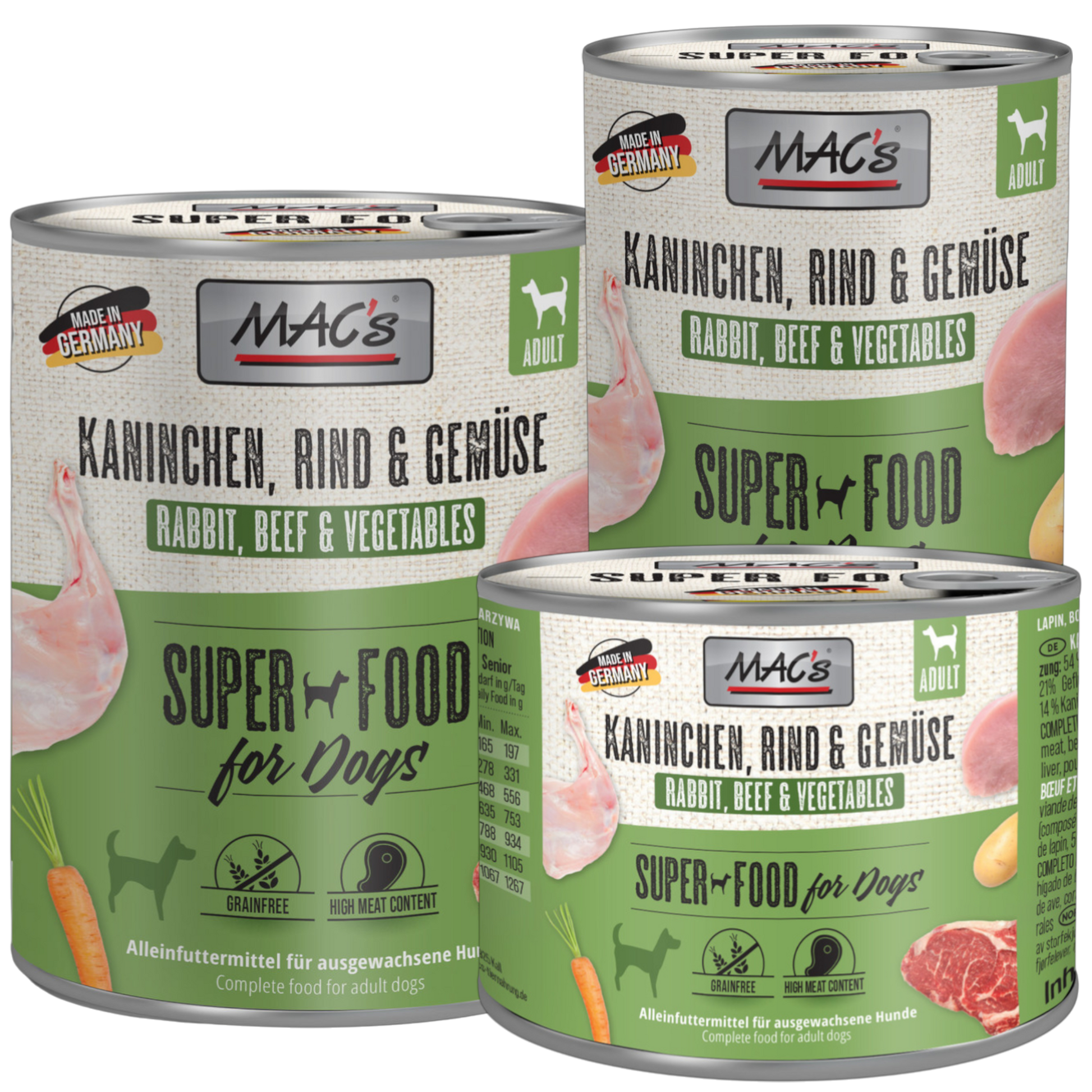 Rind bildet die nährstoffreiche Basis, ergänzt durch feines Kaninchenfleisch für Abwechslung im Napf. Geflügelbestandteile runden die Fleischkomposition harmonisch ab. Karotten und Kartoffeln liefern natürliche Vitamine sowie gut verträgliche Kohlenhydrate. Die getreidefreie Zusammensetzung sorgt für eine hohe Akzeptanz und eignet sich ideal für eine artgerechte, naturnahe Ernährung. Schonend verarbeitet und in mehreren Dosen-Größen erhältlich, ist dieses Menü optimal für den täglichen Einsatz.