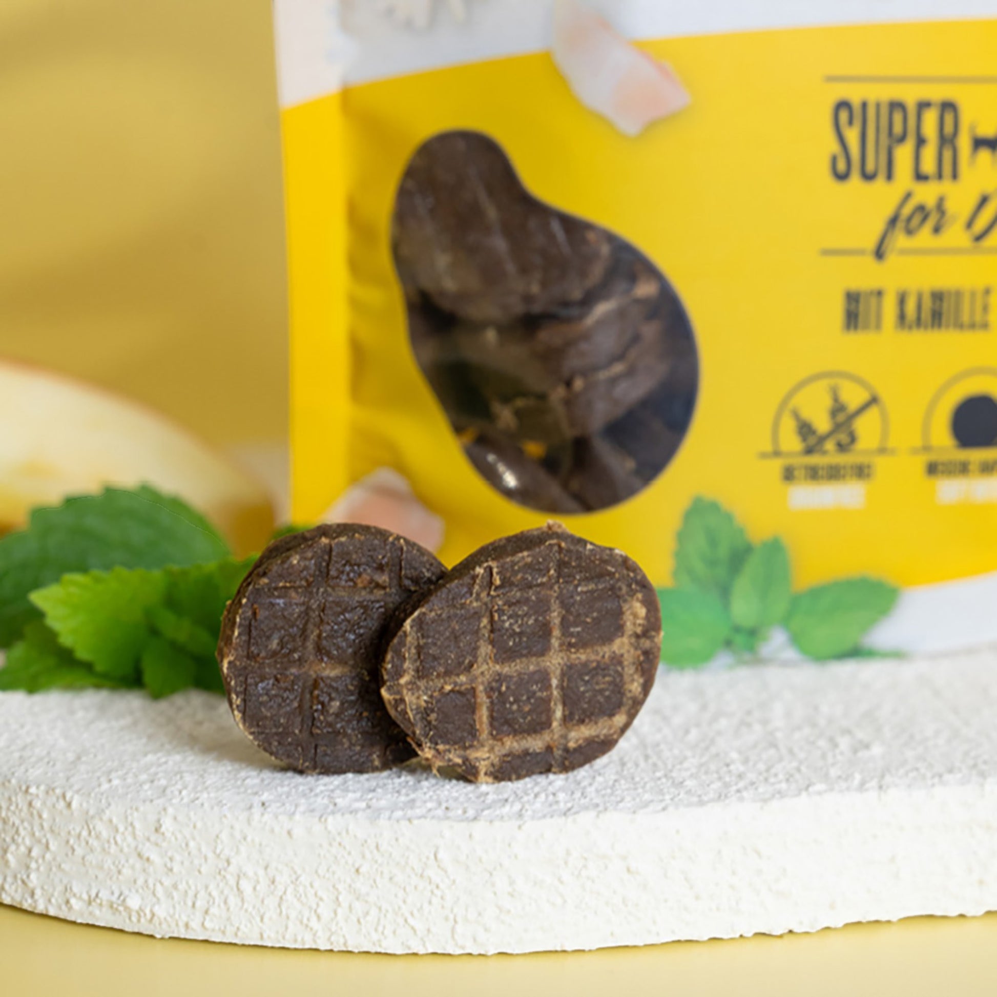 Ergänzt mit Kamille und Melisse bietet diese Rezeptur zusätzliche pflanzliche Komponenten, die die Verdauung unterstützen und gleichzeitig beruhigend wirken können. Damit eignet sich dieser Snack optimal für sensible oder stressanfällige Hunde – Genuss trifft Funktion.