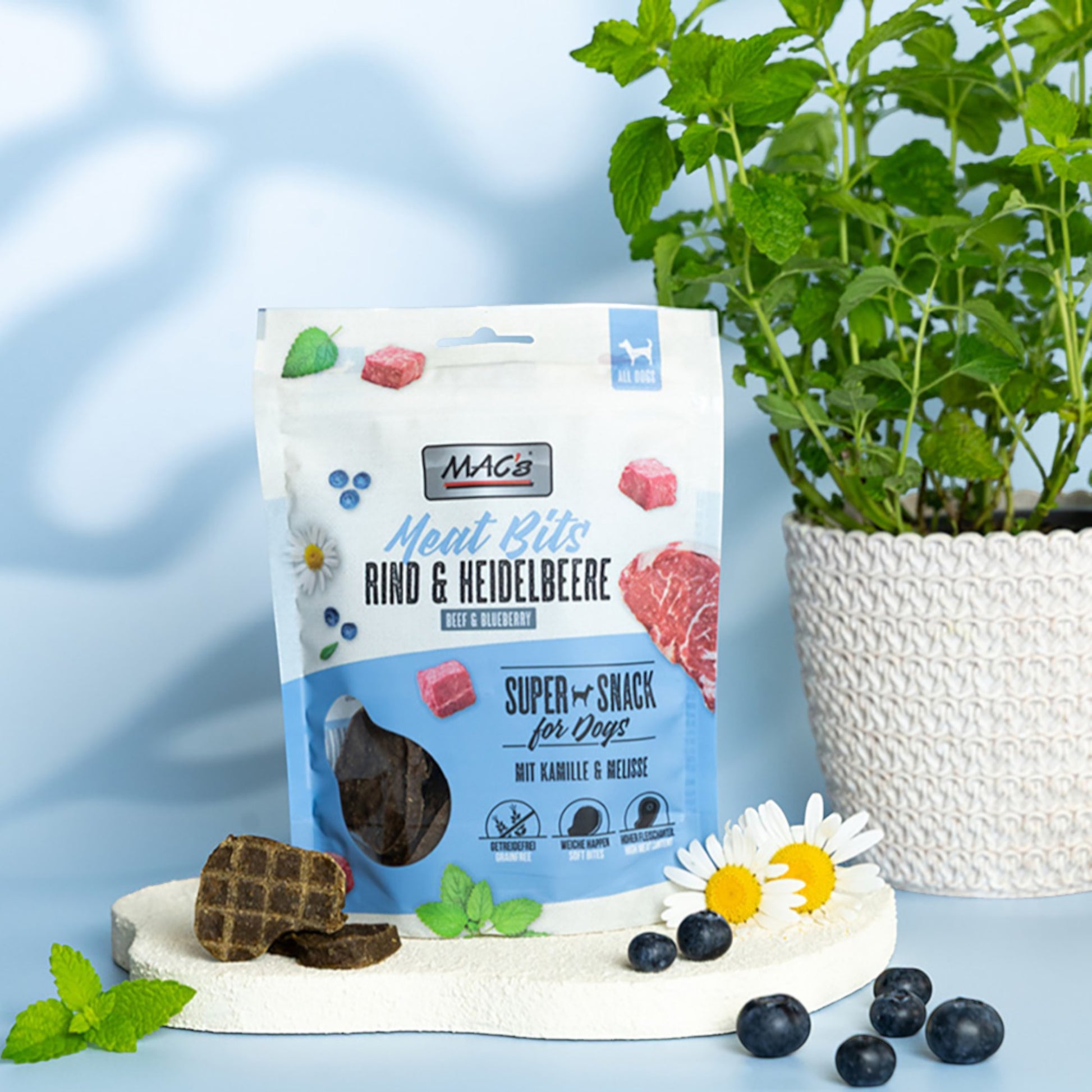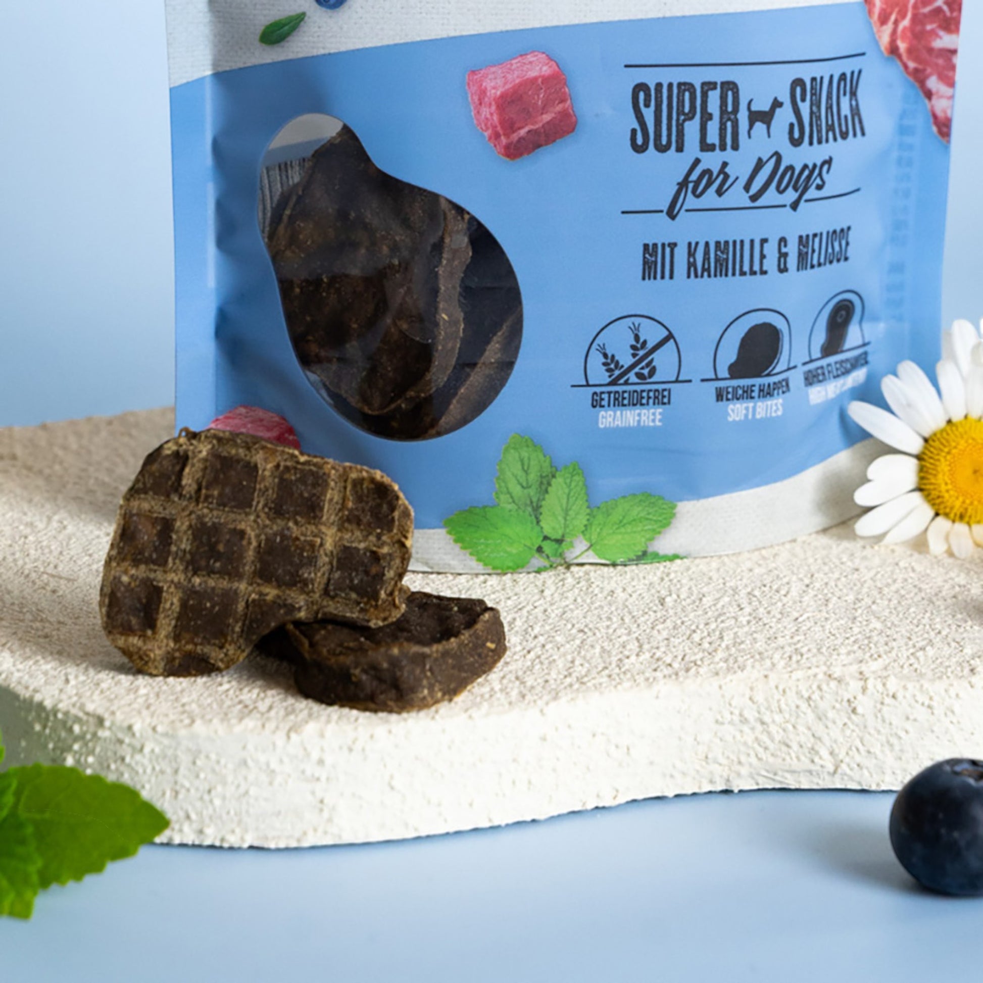Ergänzt mit Kamille und Melisse liefert diese Rezeptur funktionale Pflanzenstoffe, die die Verdauung unterstützen und gleichzeitig eine beruhigende Wirkung entfalten können. Damit positioniert sich dieser Snack als clevere Lösung für sensible oder stressanfällige Hunde – Genuss und Funktion in einem Produkt vereint.