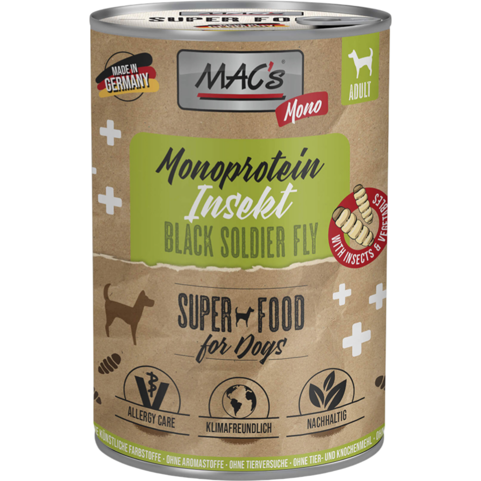 Dieses innovative Monoprotein-Nassfutter setzt auf die schwarze Soldatenfliegenlarve als alternative, nachhaltige Eiweißquelle. In Kombination mit Karotten, Kürbis und Süßkartoffeln entsteht eine besonders leicht verdauliche Rezeptur – ideal für Hunde mit Futtermittelunverträglichkeiten.