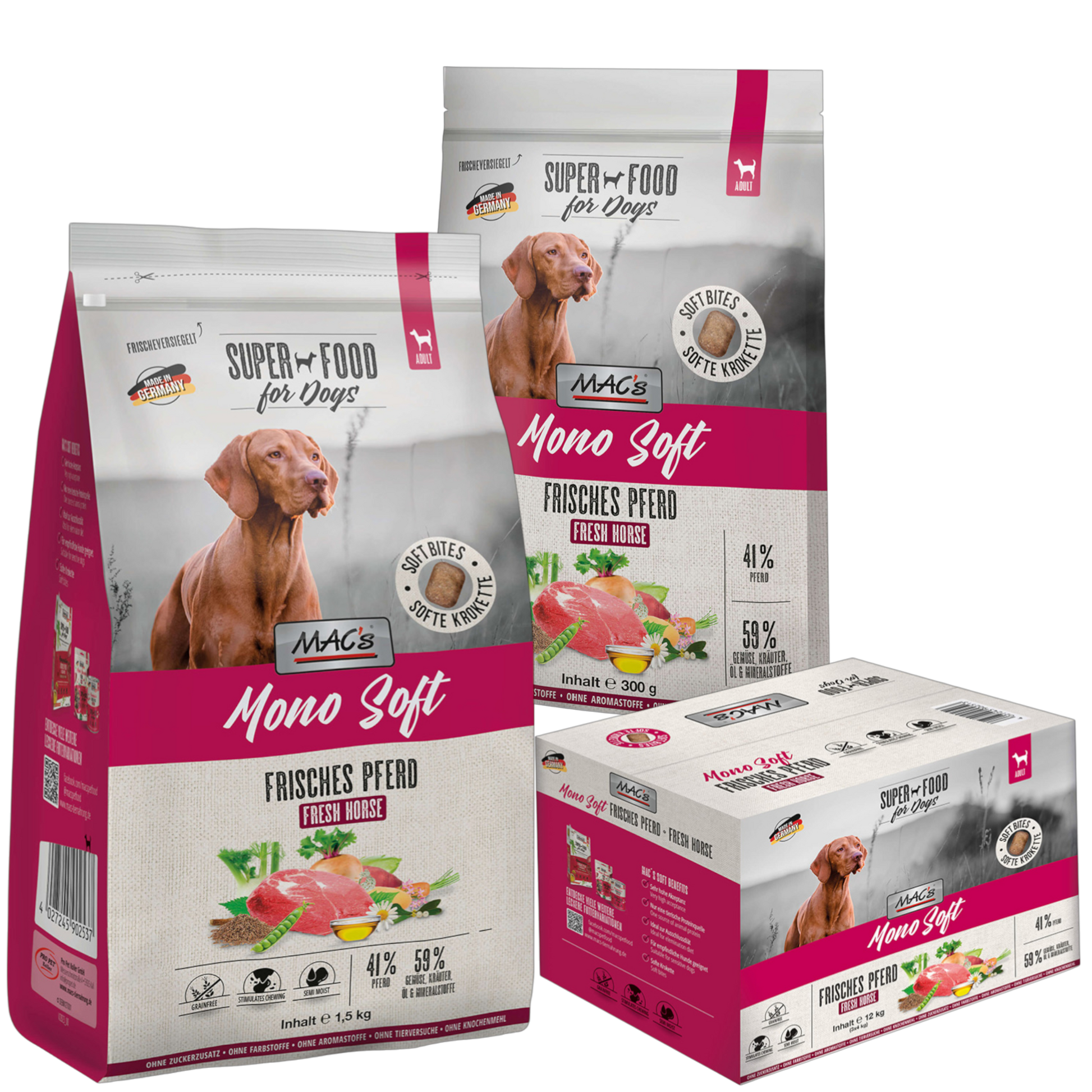 Soft, Monoprotein und optimal für ernährungssensible Hunde: Dieses halbfeuchte Alleinfuttermittel kombiniert einen hohen Anteil an frischem Pferdefleisch mit ausgewähltem Gemüse und funktionalen Kräutern. Die softe Beschaffenheit und der erhöhte Feuchtigkeitsgehalt sorgen für eine besonders hohe Akzeptanz – ideal für Hunde, die sich zwischen Trocken- und Nassfutter nicht entscheiden möchten.
