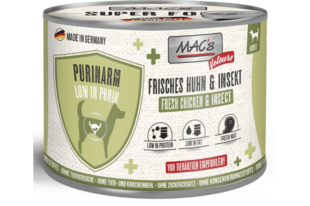 Dieses diätetisch abgestimmte Alleinfuttermittel wurde zur Unterstützung bei purinreduzierter Ernährung entwickelt. Die Kombination aus magerem, frischem Huhn und Insektenprotein (Black Soldier Fly) weist einen niedrigen Purin- und moderaten Proteingehalt auf und kann helfen, die Bildung von Harnsäurekristallen zu reduzieren. Gleichzeitig unterstützt die hochwertige Proteinbasis den Erhalt der Muskulatur.