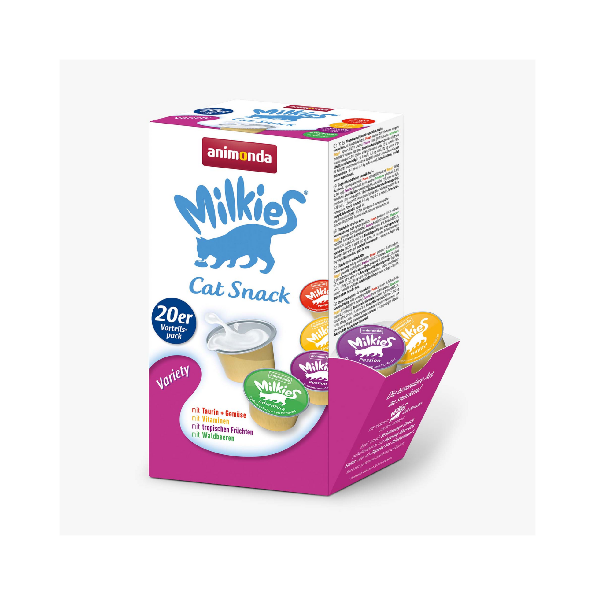Mit Milkies Adult Milchsnack Variety holen Katzenhalter ein Snackquartett ins Haus, das den Alltag ihrer Samtpfote nachhaltig aufwertet. Die vier Sorten – Power, Happy, Adventure und Passion – liefern cremige Milchsnacks, die unkompliziert anzubieten sind und jede Routine geschmacklich auflockern.