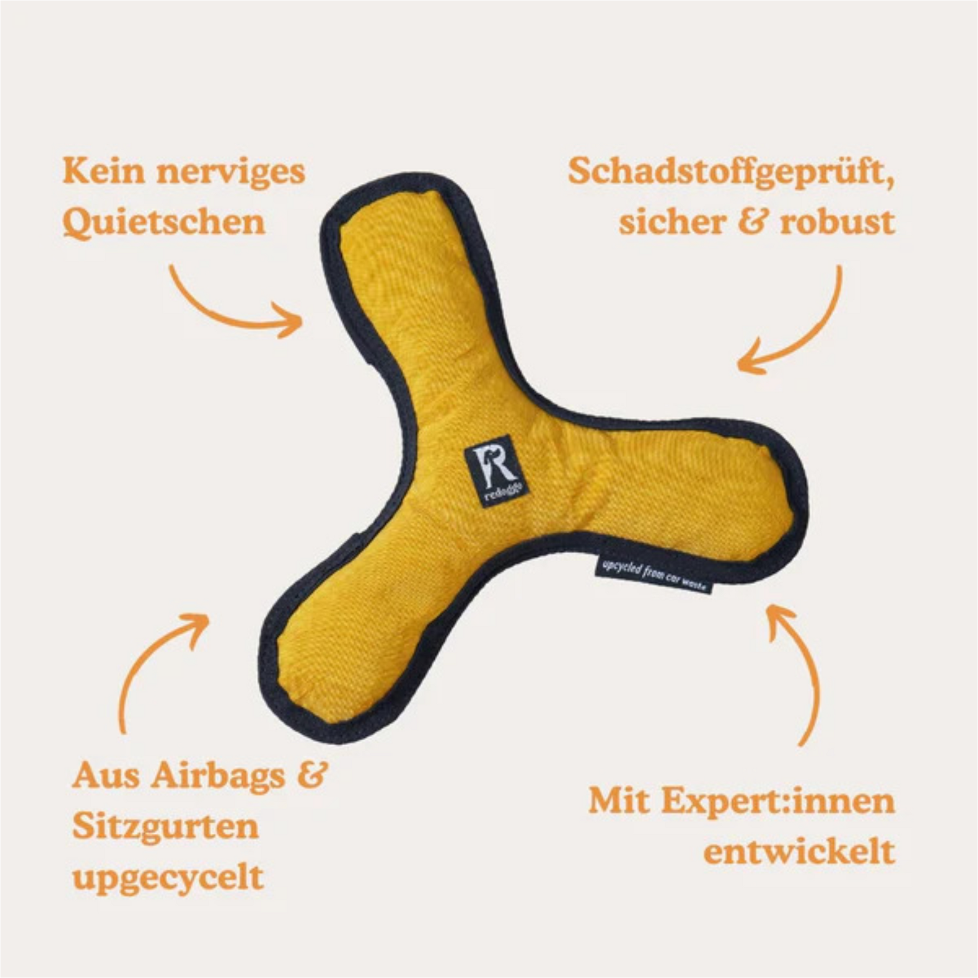 Dank strenger Qualitätskontrollen und der Verwendung besonders widerstandsfähiger Materialien ist der Redoggo Bumerang äußerst robust. Dennoch gilt: Kein Hundespielzeug ist unzerstörbar. Bitte lass deinen Hund nicht unbeaufsichtigt spielen und nutze den Bumerang ausschließlich für gemeinsames Werfen, Apportieren und aktives Spielen. Er ist kein Kauspielzeug. Sollte das Spielzeug beschädigt sein, empfehlen wir es im Sinne der Nachhaltigkeit zu reparieren oder – wenn nötig – auszutauschen.