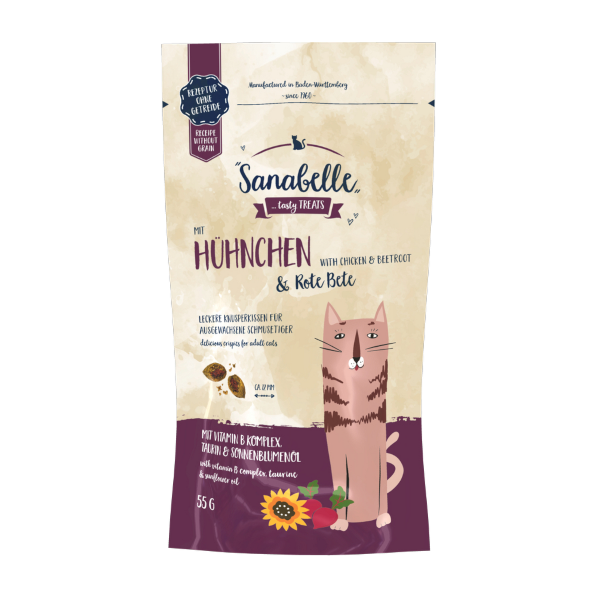 Sanabelle Knusperkissen Huhn & Rote Bete sind der ideale Belohnungssnack für ausgewachsene Katzen, die du bewusst und gleichzeitig genussvoll verwöhnen möchtest. Die Rezeptur verzichtet vollständig auf Getreide und Zuckerzusatz – perfekt für eine moderne, leicht verdauliche Snackroutine.