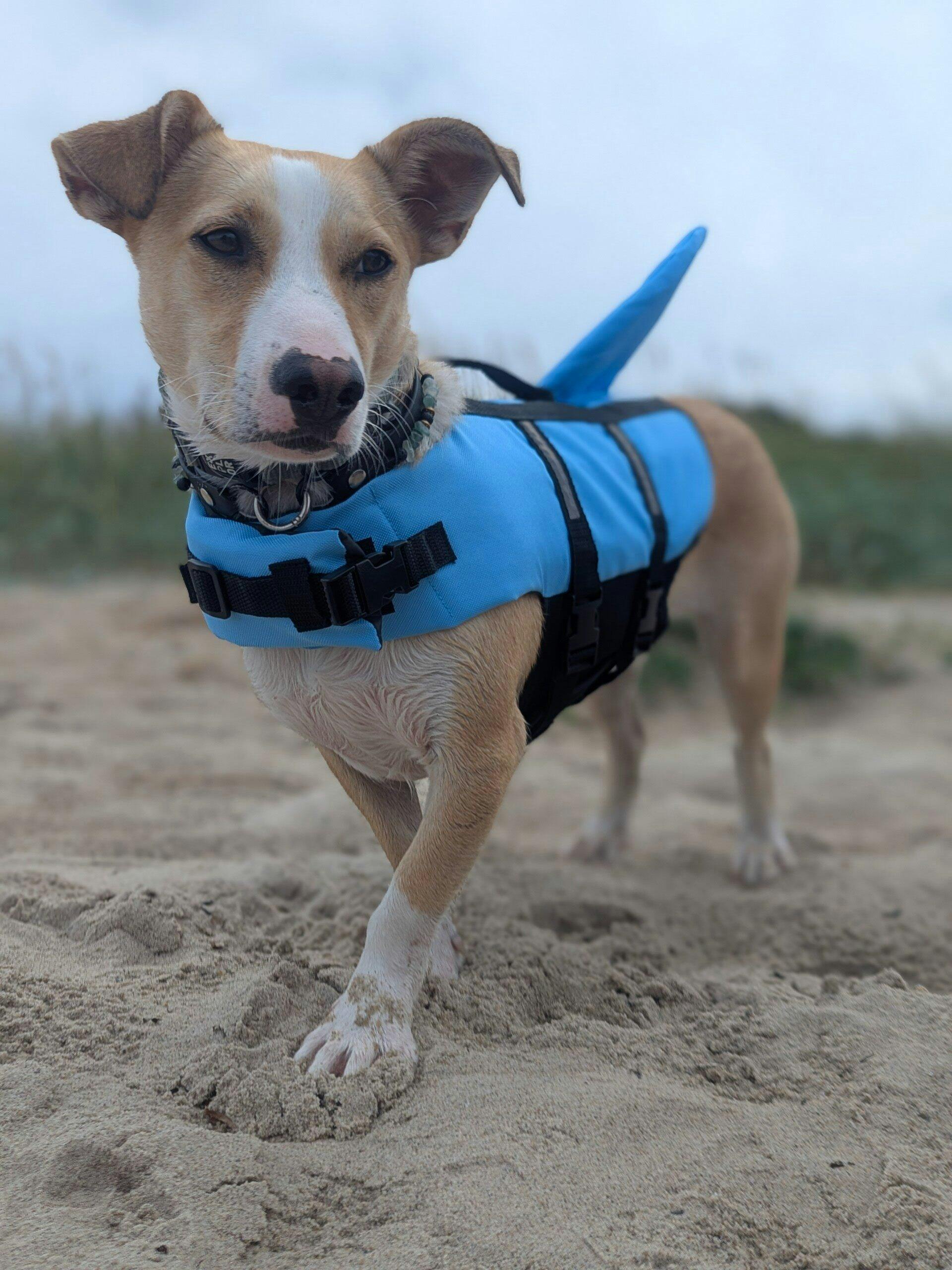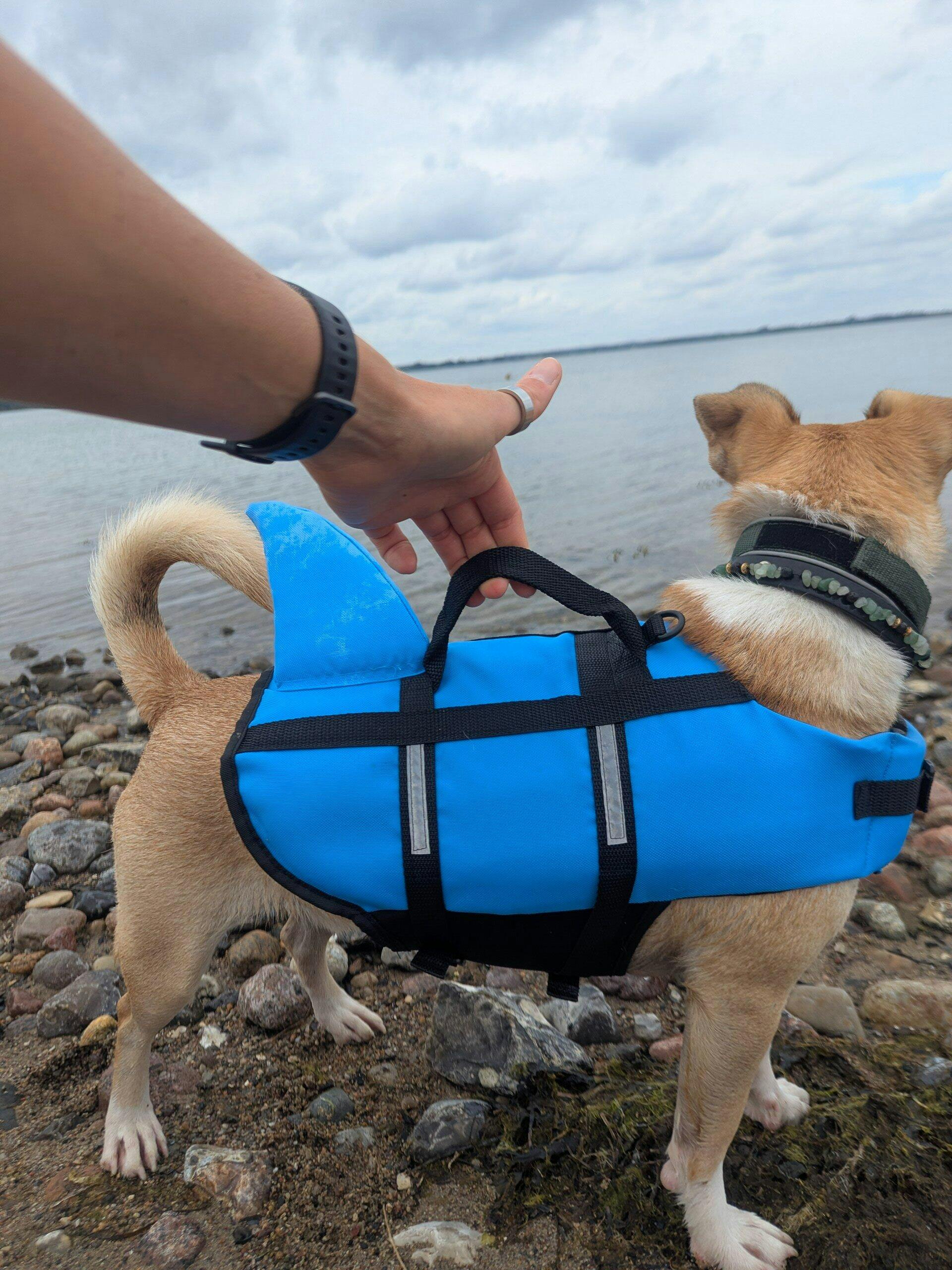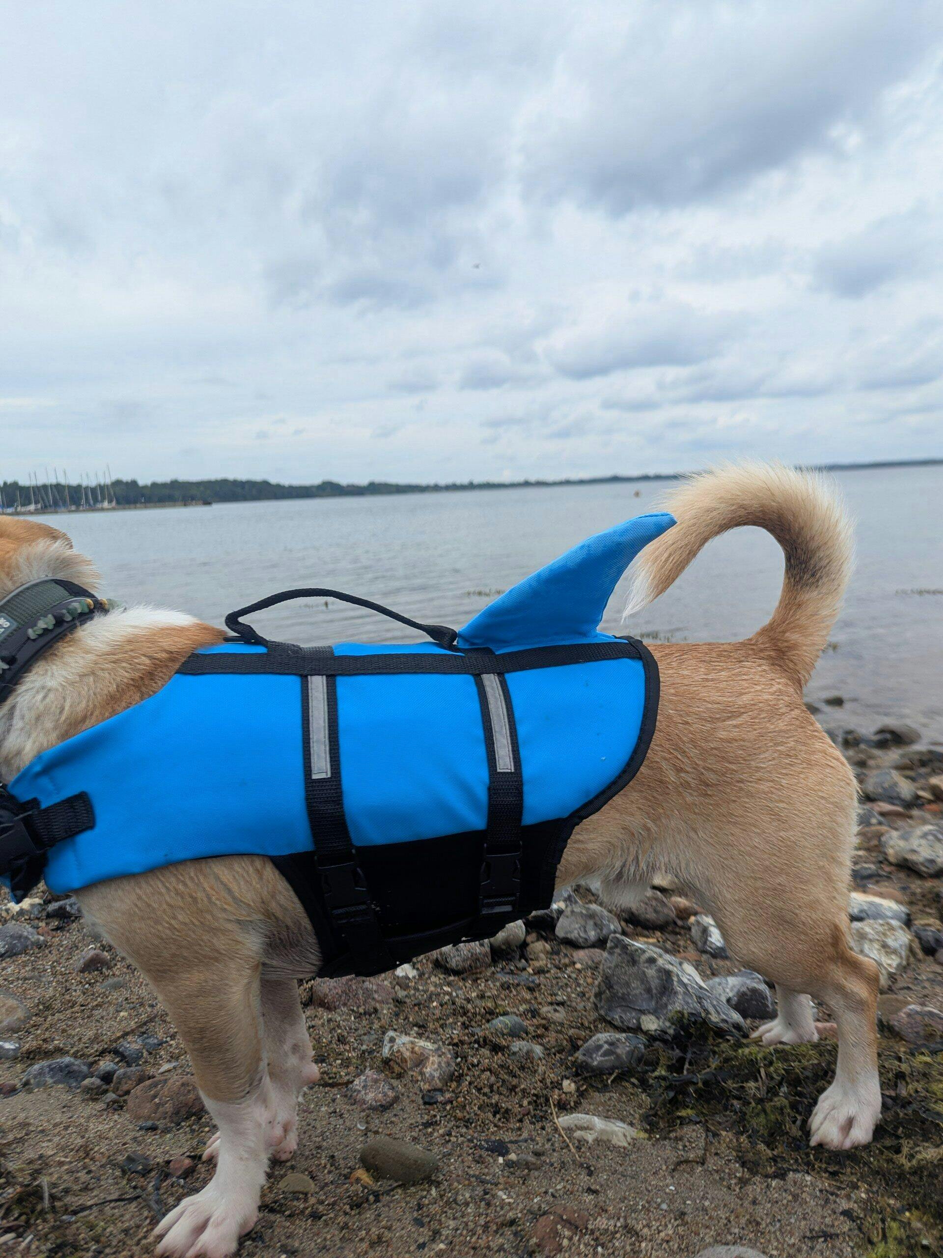 Die Schwimmweste überzeugt nicht nur mit ihrem hübschen Blauton und der witzigen Haifischflosse – sie sitzt auch richtig gut! Gerade für Hunde mit längerem Rücken bietet sie gute Unterstützung/ Entlastung im Rückenbereich.