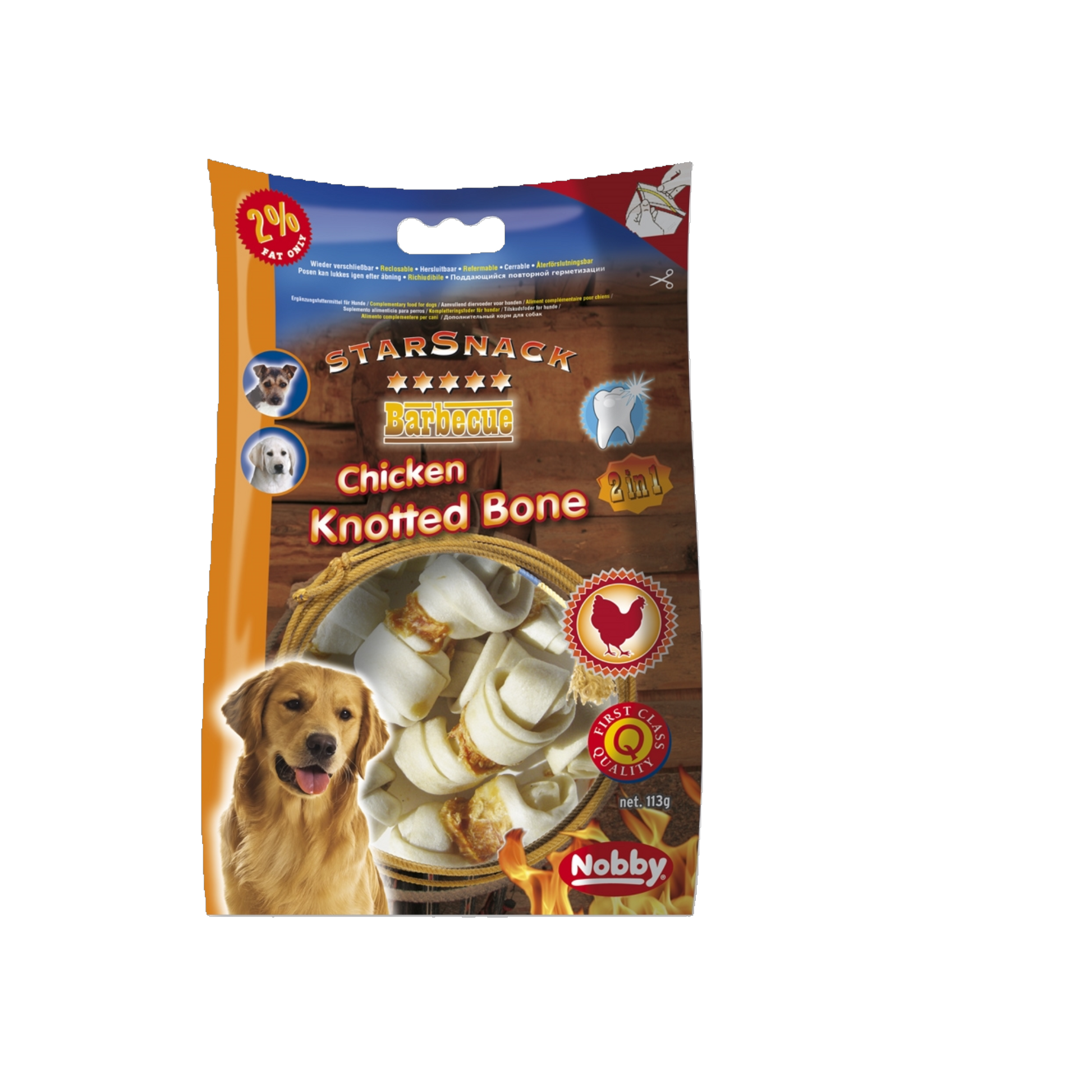 Der StarSnack BBQ Chicken Knotted Bone kombiniert natürliche Zahnpflege mit schmackhaftem Kauspaß! Dieser hochwertige Snack besteht aus 100 % natürlichen Rohstoffen – nämlich 61,35 % getrockneter Rinderhaut und 35,26 % magerem Hähnchenfleisch – und ist damit ideal zur Unterstützung der Zahnhygiene durch mechanische Reinigung beim Kauen.
