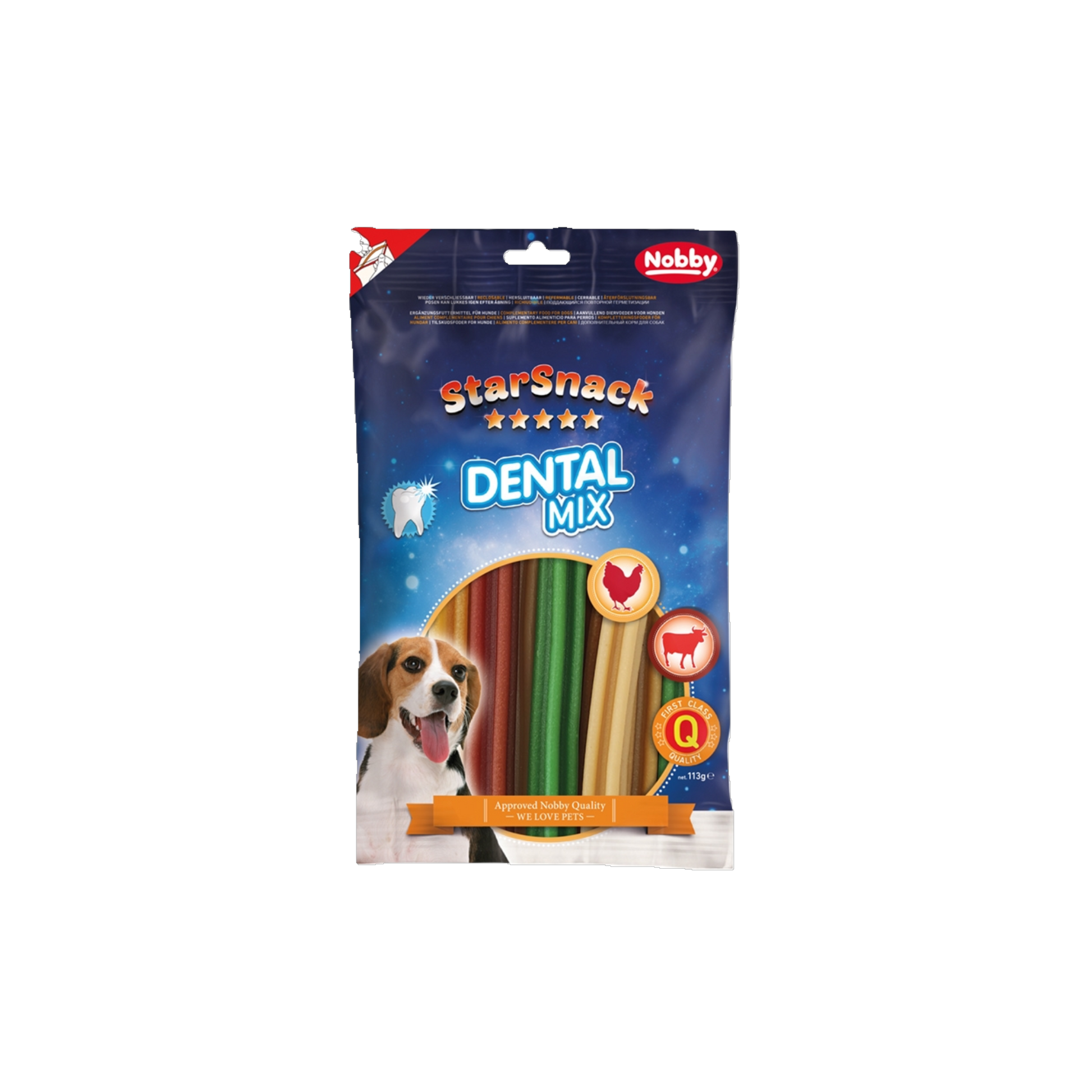Gesunde Zähne und ein frischer Atem – kombiniert mit einem unwiderstehlich leckeren Snack: Der StarSnack Dental Mix vereint funktionelle Zahnpflege mit abwechslungsreichem Genuss. Die speziell geformten Kausticks wirken mechanisch wie eine natürliche Zahnbürste – sie reinigen beim Kauen die Zähne, massieren das Zahnfleisch und helfen so, Plaque und Zahnsteinbildung zu reduzieren.