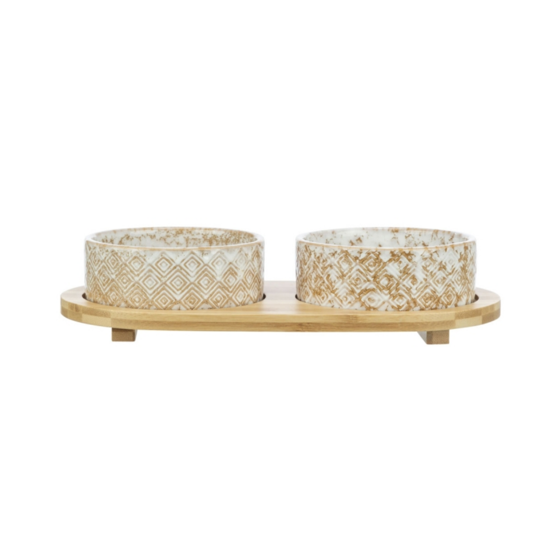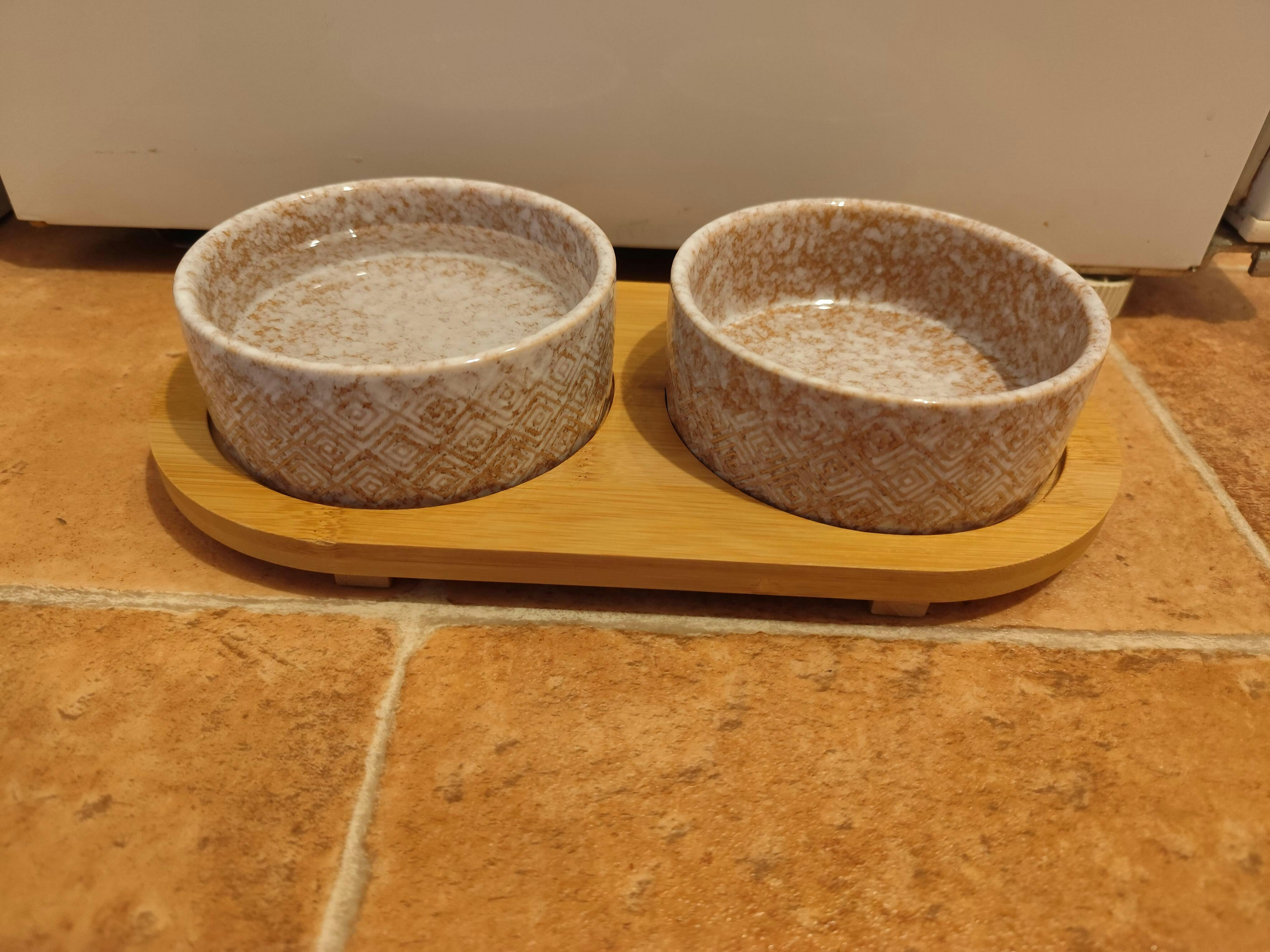 - Material: Bambushalter mit zwei Keramiknäpfen