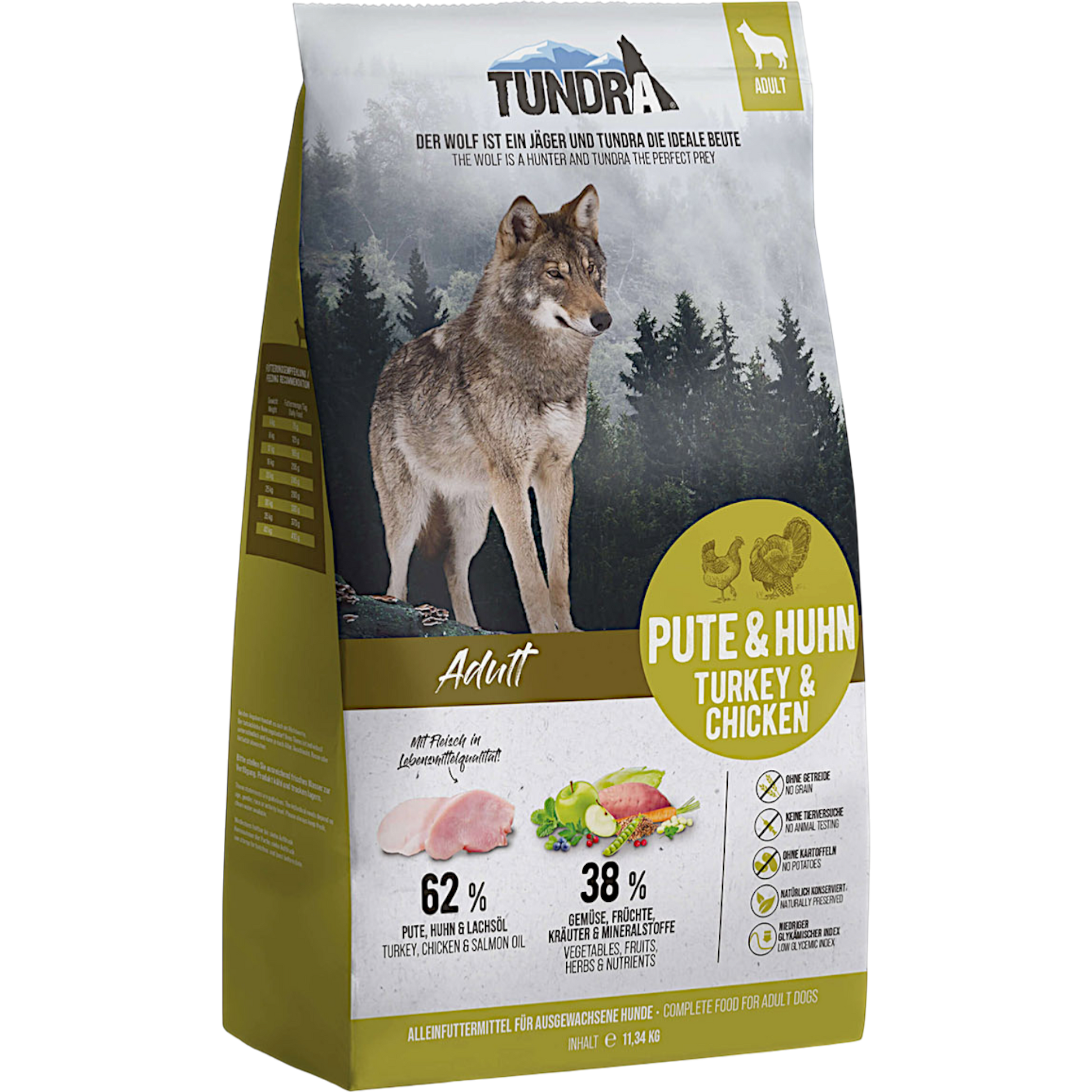 Tundra Dog Pute & Huhn ist eine ausgewogene, artgerechte Trockennahrung nach dem Wolfsbeute-Prinzip und eignet sich optimal für alle Lebensphasen des Hundes. Die Rezeptur kombiniert hochwertiges Huhn und Pute mit einem feinen Anteil Lachsöl und liefert leicht verdauliche Proteine bei hoher Akzeptanz 🐾🐔
