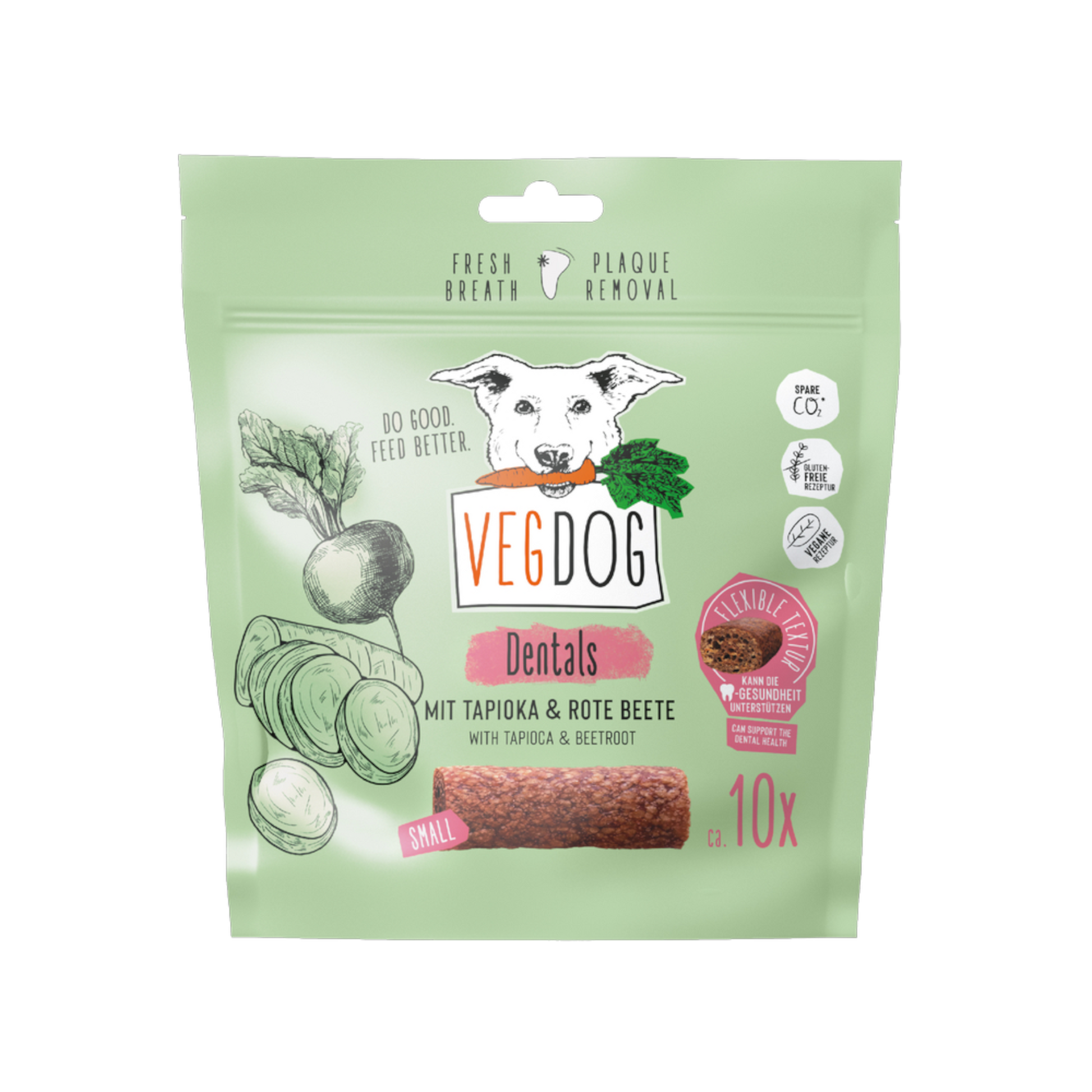 Die VegDog Dentals Tapioka + Rote Beete vereinen smarte Zahnpflege, reinen Kauspaß und nachhaltige Zutaten in einem innovativen Dentalstick – komplett pflanzlich, klimafreundlich und hypoallergen. Perfekt für alle Hunde, auch für sensible Vierbeiner mit Unverträglichkeiten.