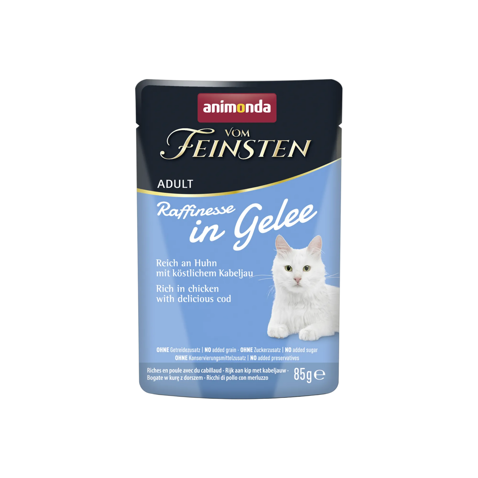 Diese Variante verbindet mildes Huhn mit aromatischem Kabeljau – eingebettet in ein feines, glänzendes Gelee, das selbst wählerische Katzen begeistert. Eine ausgewogene Rezeptur, die geschmacklich wie ernährungsphysiologisch punktet.